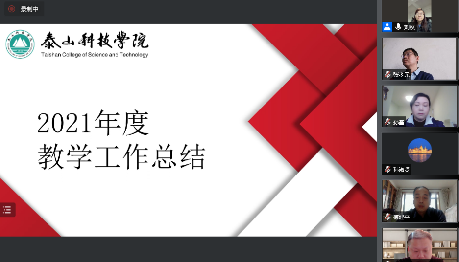 随后,集团三校就2021年度教学工作分别进行汇报总结。泰山科技学院副校长智英斌从学校各项常规教学工作、教学工作内涵建设、学校特色品牌建设以及存在的问题与不足四个方面对泰山科技学院2021年度教学工作进行汇报。他谈到,2021年里各教学单位目标明确、分工清晰、职责清楚,严格执行学校教学管理制度,组织完成教学管理工作,教学运行平衡有序。在常规教学工作方面,学校积极开展教师培训、人才培训等各项活动、全生异科导师制、“十四五”实验室建设规划等;在教学工作内涵建设方面,深化教育教学改革,建设一流本科专业及加强国际教育合作,助推学校品牌建设;但同时,智英斌副校长表示,教学工作虽取得一定成绩,但在教学秩序、教学科研力度、专业建设体系、师资队伍建设、校企合作等方面仍存在不足,他强调,学校将从现存问题对症下药,对标治本,团结各教学单位,全力以赴促进全校教学工作更上一个台阶。