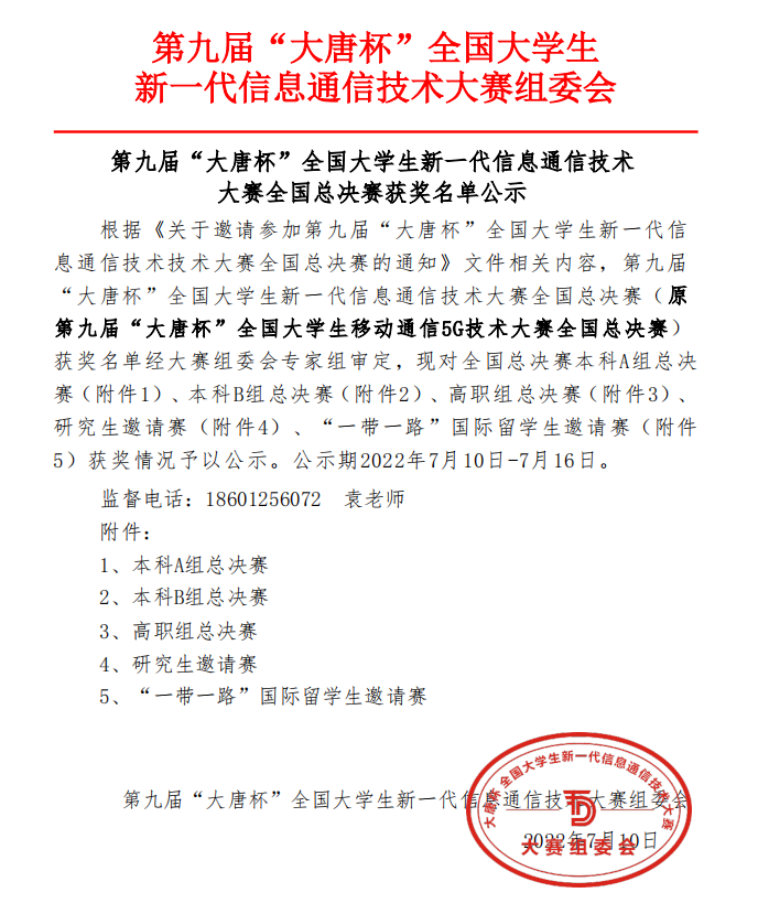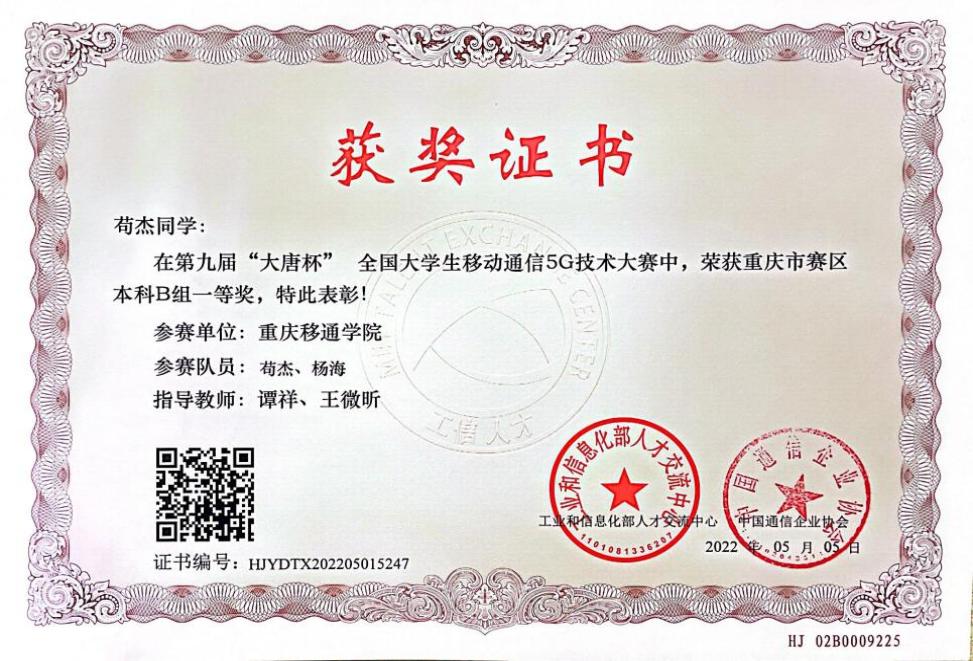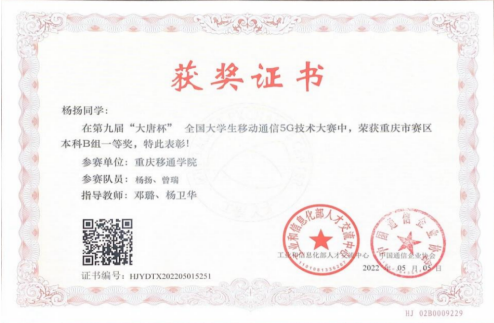 近日,第九届“大唐杯”全国大学生移动通信5G技术大赛(又名“大唐杯”全国大学生新一代信息通信技术大赛)全国总决赛落下帷幕。我校学子在本届大赛中获得重庆市本科B组一等奖6组、二等奖12组、三等奖34组,获得一等奖的6组学生成功晋级国赛;在全国总决赛中获得全国本科B组一等奖、二等奖、三等奖各1组,全国优秀奖3组,打破了我校在历届大唐杯比赛中的获奖纪录。