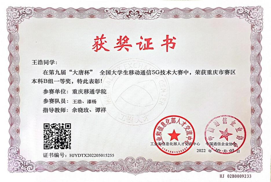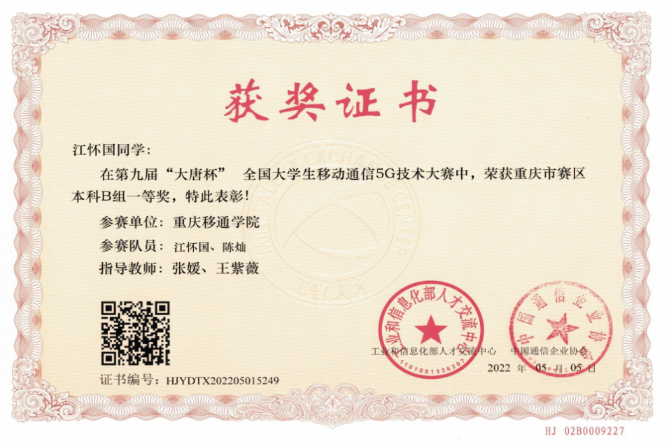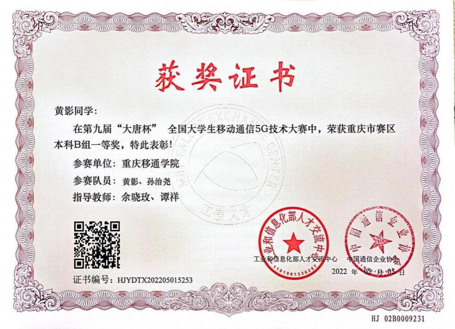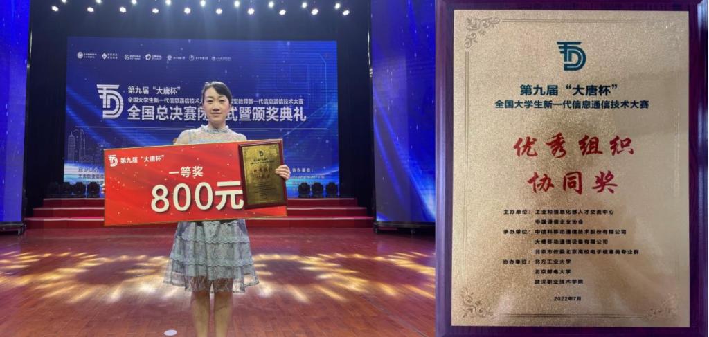 “大唐杯”全国大学生移动通信5G技术大赛作为全国A类竞赛中首个移动通信类竞赛项目,致力于为国家信息通信产业培养新一代通信技术人才。本次比赛本科组共有2800余名选手竞技全国总决赛,我校学生能够脱颖而出在全国总决赛中揽括全国一、二、三等奖,实属不易。由于本次比赛,我校在组织工作、参赛工作、获奖方面表现突出,组委会授予我校“优秀组织协同奖”称号,并邀请我校负责本次大赛的余晓玫老师代表学校参加了在武汉举办的第九届“大唐杯”全国总决赛闭幕式暨颁奖典礼(南部赛区),一同出席闭幕式的高校还包括电子科技大学、重庆邮电大学、重庆工程职业技术学院、武汉职业技术学院等高校。