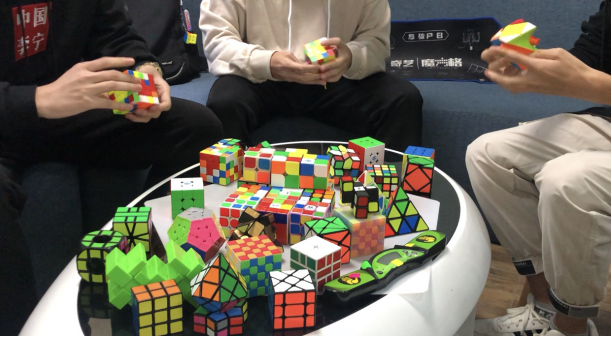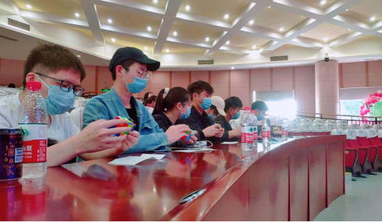 三阶速拧二等奖获得者袁滔同学为我校现任魔方社社长,他介绍魔方追逐战是魔方社日常应用最多的训练娱乐方式,只要手里有魔方,只要身边有同伴,随时可以开展,四个人同向追赶遇见还原的魔方打乱,遇见打乱的魔方就还原,坚持到最后即为胜者。这样的互动挑战在魔方社还有很多。魔方在侧,随时可以开始三个人倒计时复原魔方的比赛,无关名次的日常训练恰恰是对魔方的日积月累,在平淡中坚持爱好。