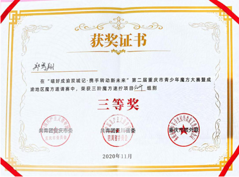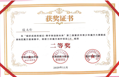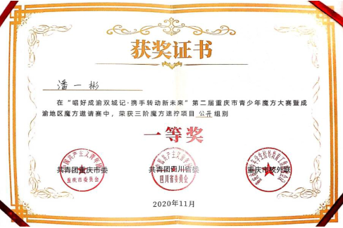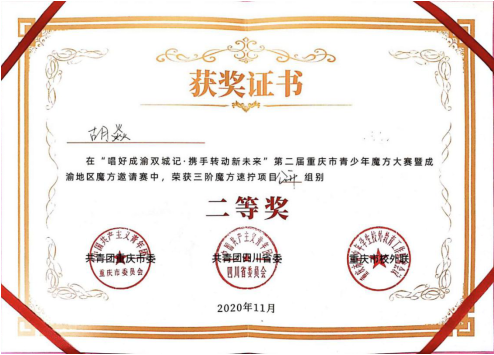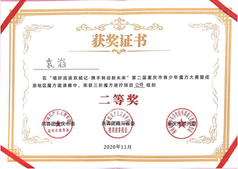 2020年12月5日第二届重庆青少年魔方大赛暨成渝地区魔方邀请赛闭幕式在重庆南渝中学举行。本次活动由共青团重庆市委、共青团四川省委等单位联合主办,重庆市青少年新媒体中心、重庆市青少年社会教育协会共同承办。我校魔方社率领9名选手经过激烈的比拼斩获一等奖1项、二等奖4项、三等奖1项,创历史新高。