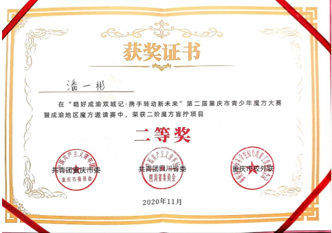 魔方复原的时间虽短,考验的突破的能力最难,但最光彩夺目的瞬间就是还原的那一刻,魔方一直以它独特的魅力渲染着世界的每一个角落。据悉,本次大赛共设三阶魔方速拧和二阶魔方盲拧两个项目,其中三阶魔方速拧项目分设U6、U8、U10、U12和公开组五个组别,参赛选手最小年龄4岁,最大年龄35岁。大赛自10月份启动以来,共吸引川渝两地5000余名魔方爱好者参与,经预选赛、复赛、决赛,三阶速拧项目成渝赛区各组别分别决出了一等奖16名、二等奖16名、三等奖32名,二阶盲拧项目成渝赛区分别决出了一等奖2名、二等奖4名、三等奖8名。我校9人参赛获奖6项,获奖率占67%,获奖总数占所有奖项的7%。