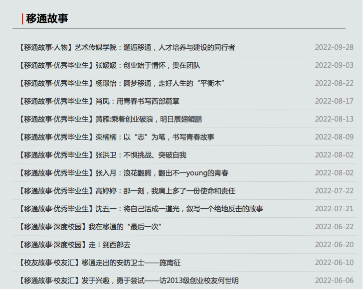 “移通故事”是品牌营销与新闻中心立足移通极致的完满教育、充分的通识教育、基本的商科教育、必要的专业教育,通过讲述属于移通自己的故事,体现其国内领先的特色教育,让更多的人知道移通、了解移通,传播属于移通自己的精神、文化、价值,结合移通品牌营销的日常宣传工作,进一步塑造移通品牌形象的综合性新闻报道专题栏目。
