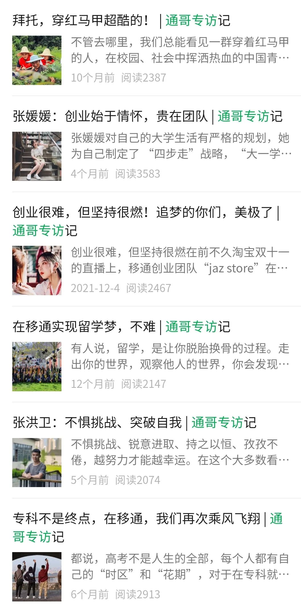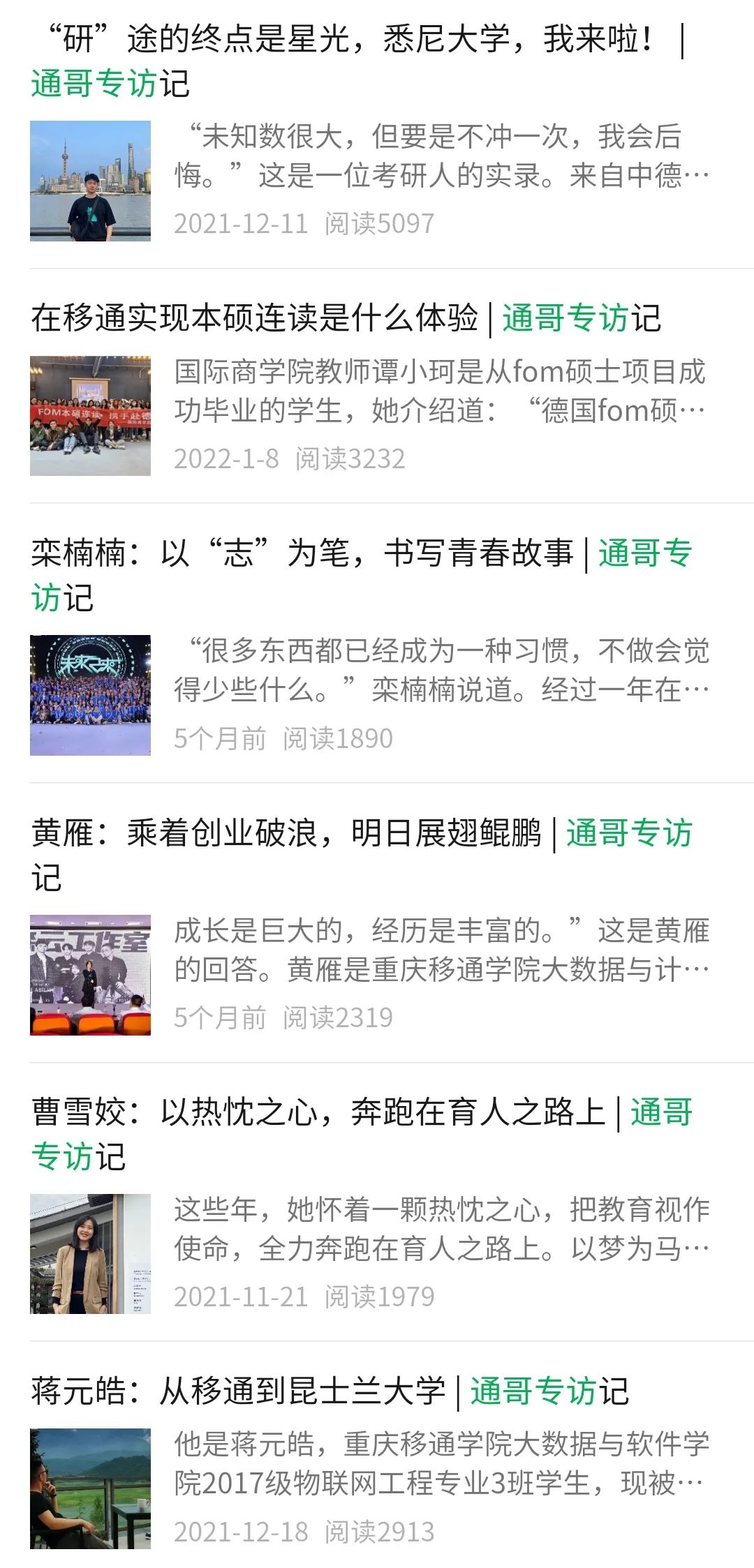 经过两年的栏目建设、完善和改进,通过不断走访、挖掘、撰写深度采访报道,目前已陆续开通“移通故事·人物”“移通故事·深度校园”“移通故事·校友汇”“移通故事·优秀毕业生”“移通故事·优秀教师”等多个子栏目,在官方微信公众号增设“通哥专访记”标签栏目,共计发表各类型原创稿件140+篇,获得校内师生众多认可和赞扬。文章相继在中青网、中国教育在线、中国大学生在线、重庆日报、重庆市共青团、重庆晨报、今日头条、搜狐新闻、腾讯新闻、腾讯校园等外媒平台发表,部分文章反响强烈。