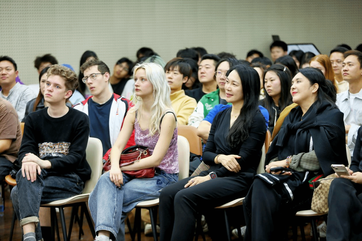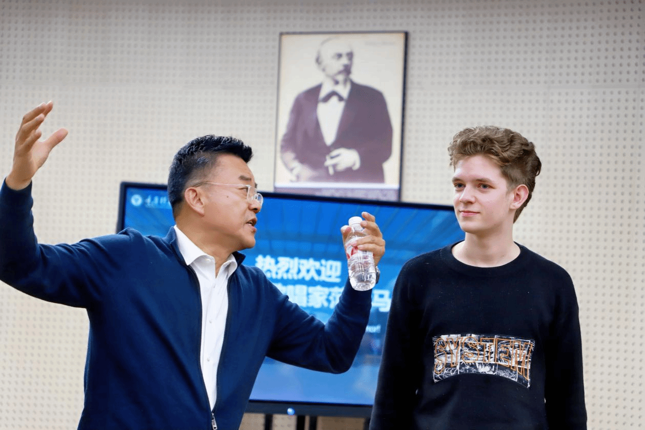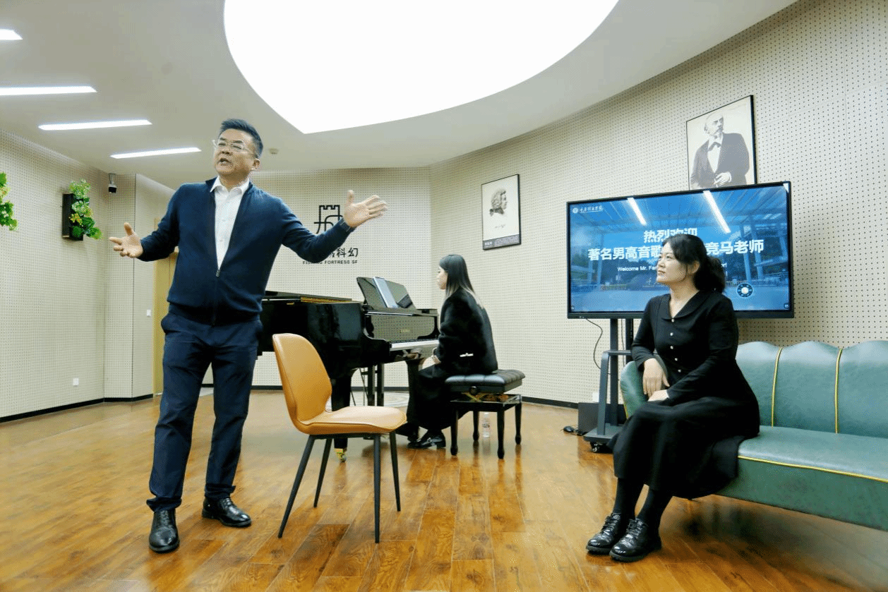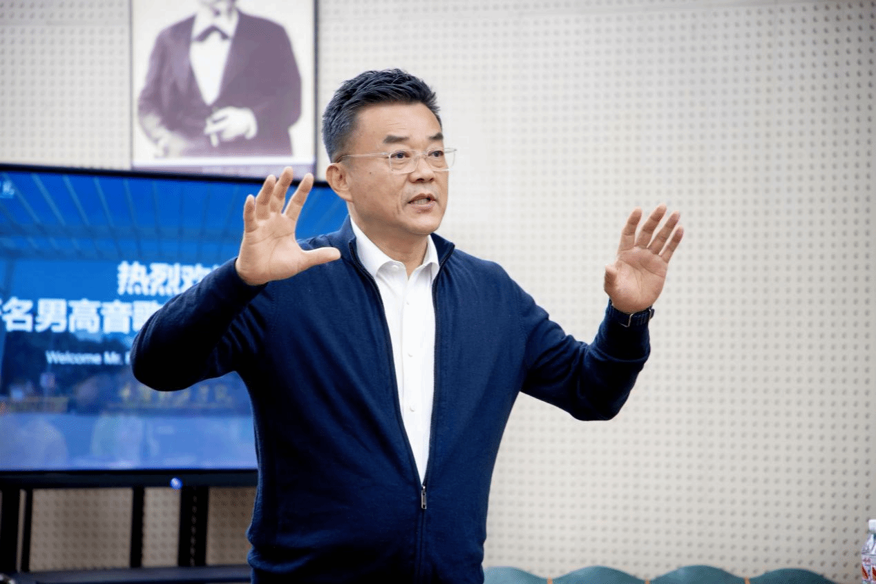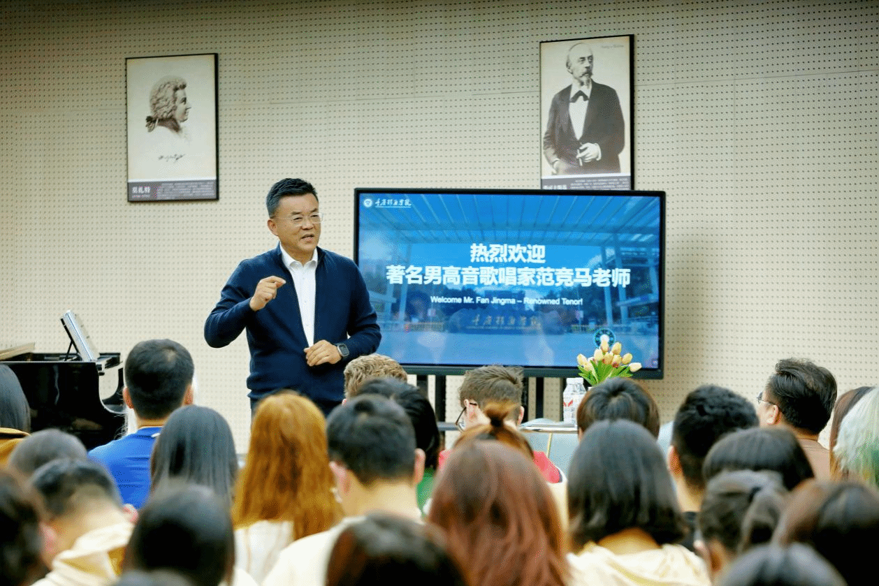 现场互动中,范竞马和葛爱新、龙潇雨等演绎《望乡词》、意大利民歌的唱法,针对学生演唱细节进行指导,他带领学校留学生示范“万能母音”发声方式,引导现场积极互动,国际化的声浪在共鸣腔体中交织回旋。强调对歌词的“敬畏心”,注重含蓄表达与情感传递,通过具体曲目示范如何通过含蓄的音色变化营造歌词的“神秘感”,展现声乐表演中意境营造的关键作用。他还指导聆听合唱团《如愿》曲目演唱,频频点赞并指出:“要用‘万能母音’发声,当声音是空的时候,装任何东西、情感和理想状态。当声音填满了虚荣心和自负,这时候什么也装不进去。”