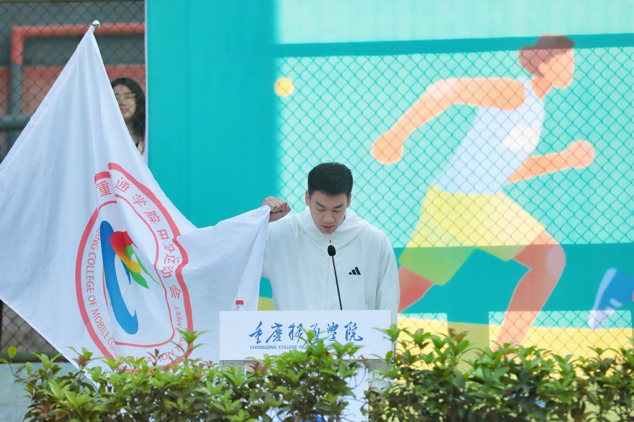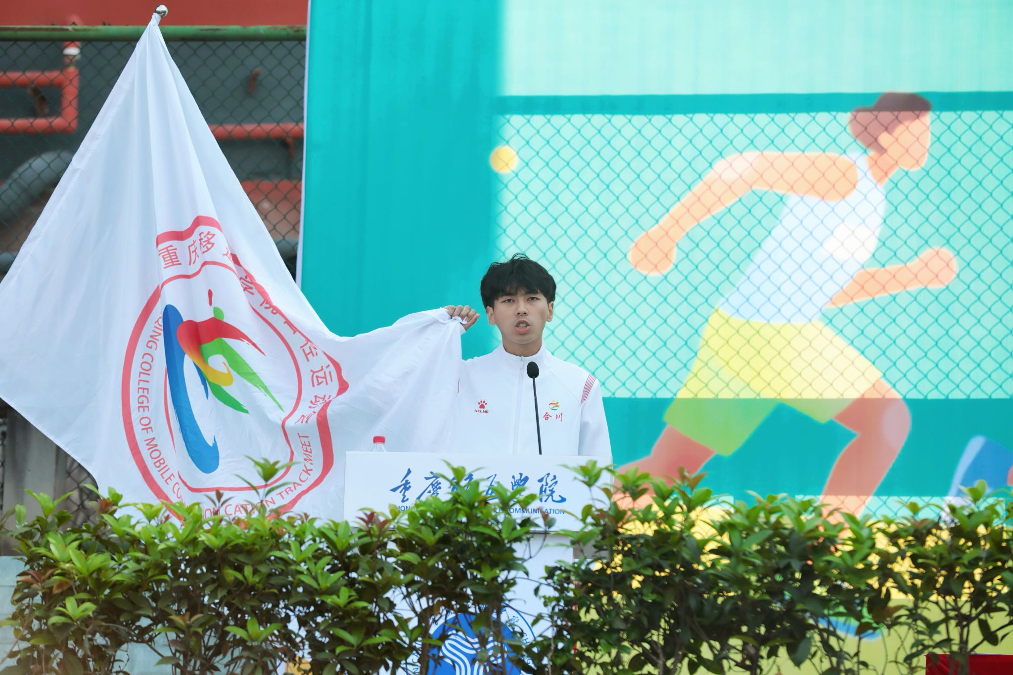 校田径队队员、2023级通信与信息工程学院杨超代表全体运动员宣誓,承诺遵守比赛规则,尊重对手,赛出风格、赛出水平,展现出运动员们的竞技精神与道德风尚。