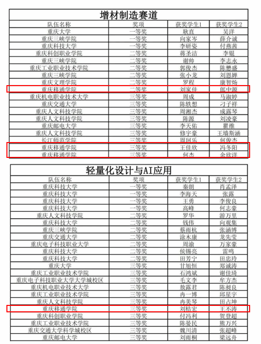 开放赛道共四支队伍获奖,其中增材制造赛道,刘家佳和郎中源荣获二等奖,王佳欣、冯冬阳、何杰和余欣洋同学荣获三等奖。轻量化设计与AI应用赛道,刘桔宏和王丕涛同学荣获三等奖。