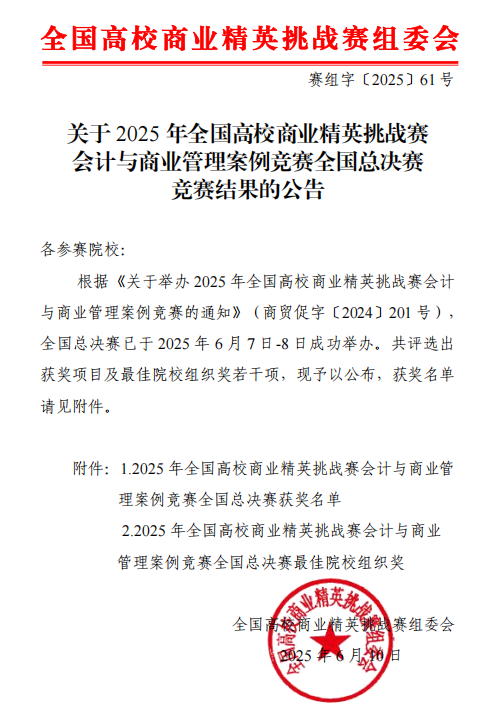 经过前期各阶段的激烈角逐,我校共有9支团队凭借出色表现脱颖而出,成功跻身全国总决赛。2025年6月7日至8日,全国高校商业精英挑战赛会计与商业管理案例竞赛全国总决赛在线上顺利举行。最终,我校在本次全国总决赛中收获满满,共揽获9项大奖:其中,1支团队斩获2025全国高校商业精英挑战赛会计与商业管理案例竞赛全国总决赛一等奖、6支队伍斩获二等奖,2支队伍斩获三等奖。
