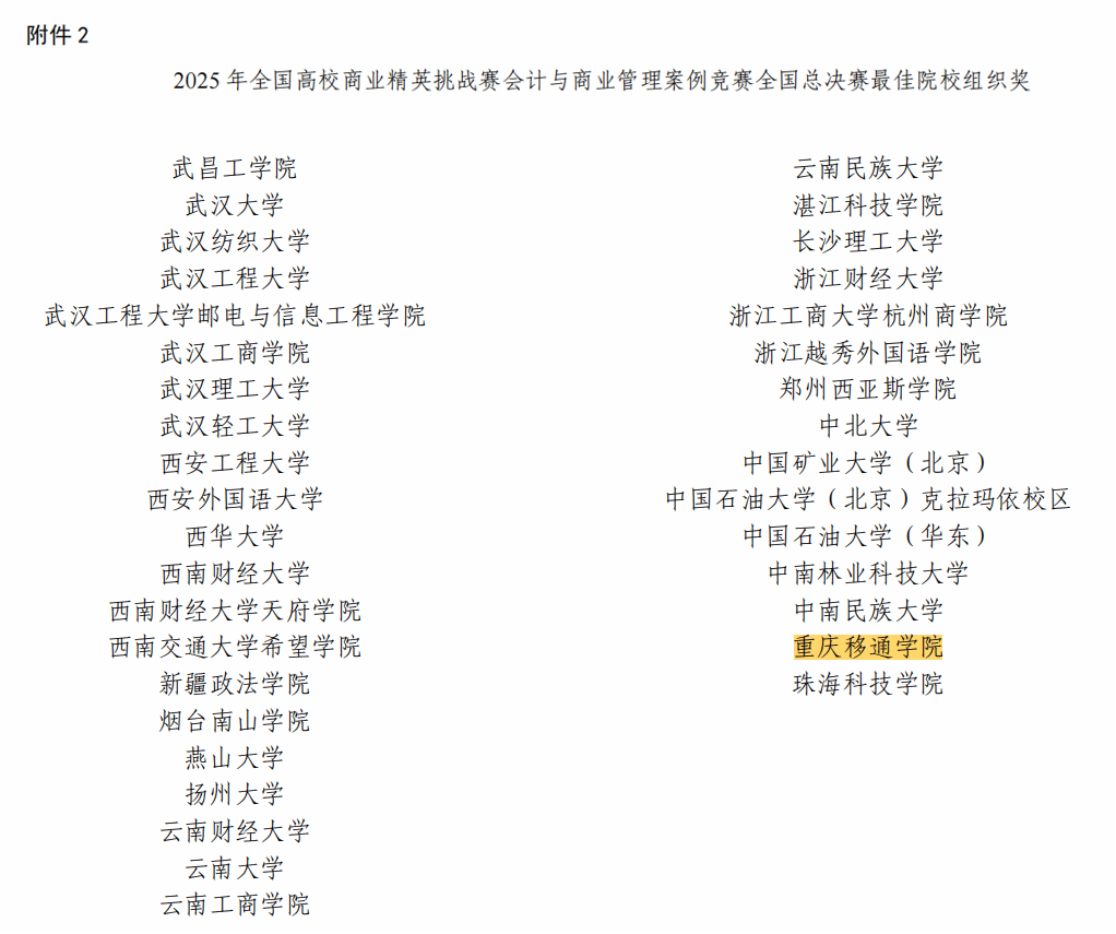 此外,我校还荣获2025年全国高校商业精英挑战赛会计与商业管理案例竞赛全国总决赛最佳院校组织奖。 此次竞赛的优异成绩,不仅是对我校参赛师生辛勤付出的最好回报,更是对我校商科教育教学成果的有力证明。淬炼商学院与新商科教学部将继续秉持“以赛促教、以赛促学、以赛促改”的理念,不断深化教育教学改革,优化课程体系,加强实践教学环节,为培养更多适应社会需求的高素质复合型应用型财务管理人才而不懈努力。
