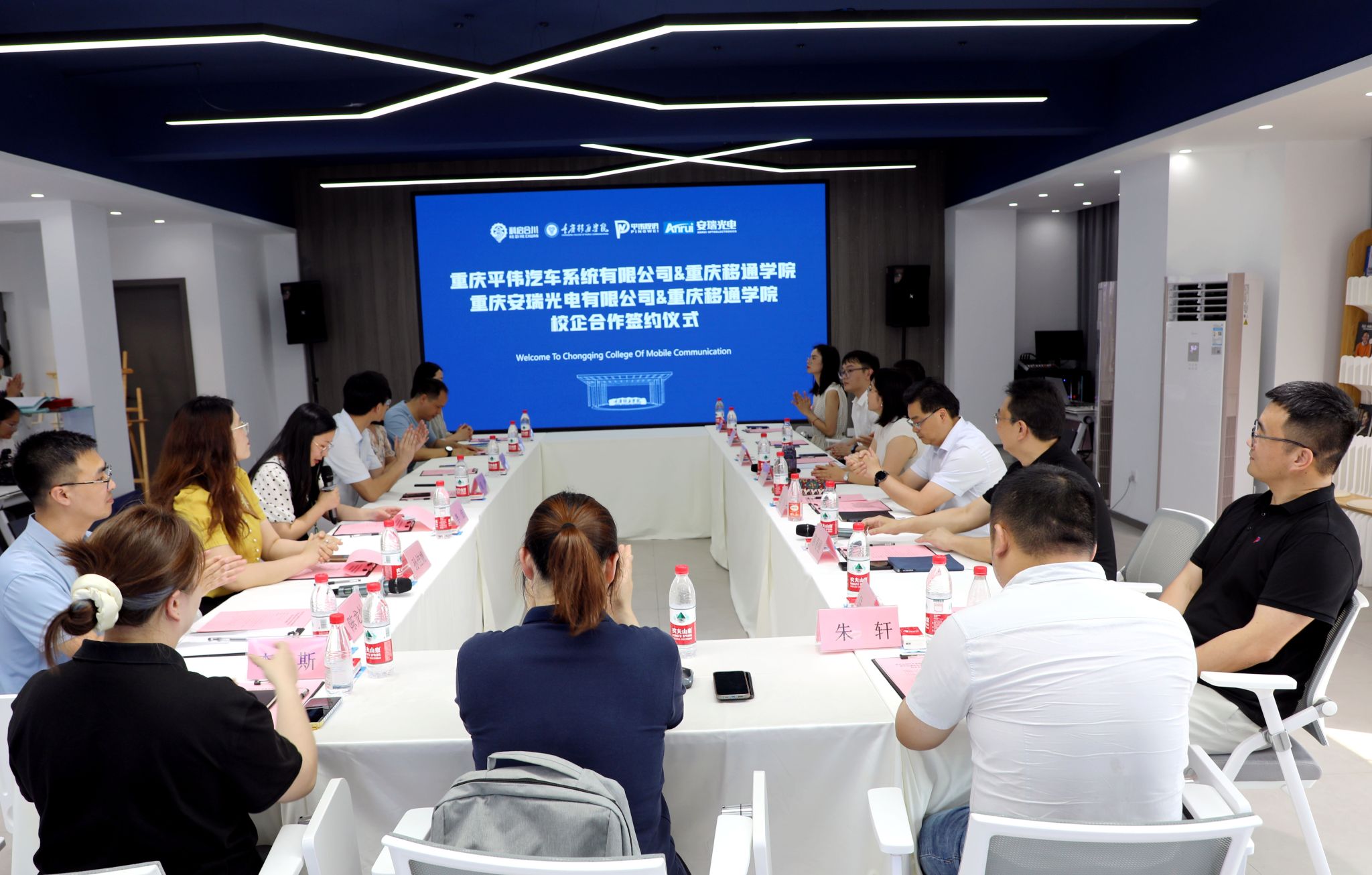 6月12日下午4点,重庆移通学院在松格书院完满展厅隆重举办校企合作签约仪式。此次活动汇聚政、校、企多方代表,共同推进产教融合新路径。重庆市合川区科学技术局党组书记、局长张玉蝉,副局长郑平,科长向梅;重庆平伟汽车系统有限公司总经理陈寿刚、人力资源总监陆峦、招聘专员李斯;重庆安瑞光电有限公司总经理李及春、综管部长于力勇、行政主任朱轩、招聘主管赵纯香;重庆移通学院党委副书记、常务副校长周伟,书院部副部长孙佳婧、主任陈钎华,智能工程学院院长党晓圆、教学副院长李洁、学工副院长祝玮、教研室主任陈龙灿及寇晓培出席仪式,本次会议由李洁副院长主持。