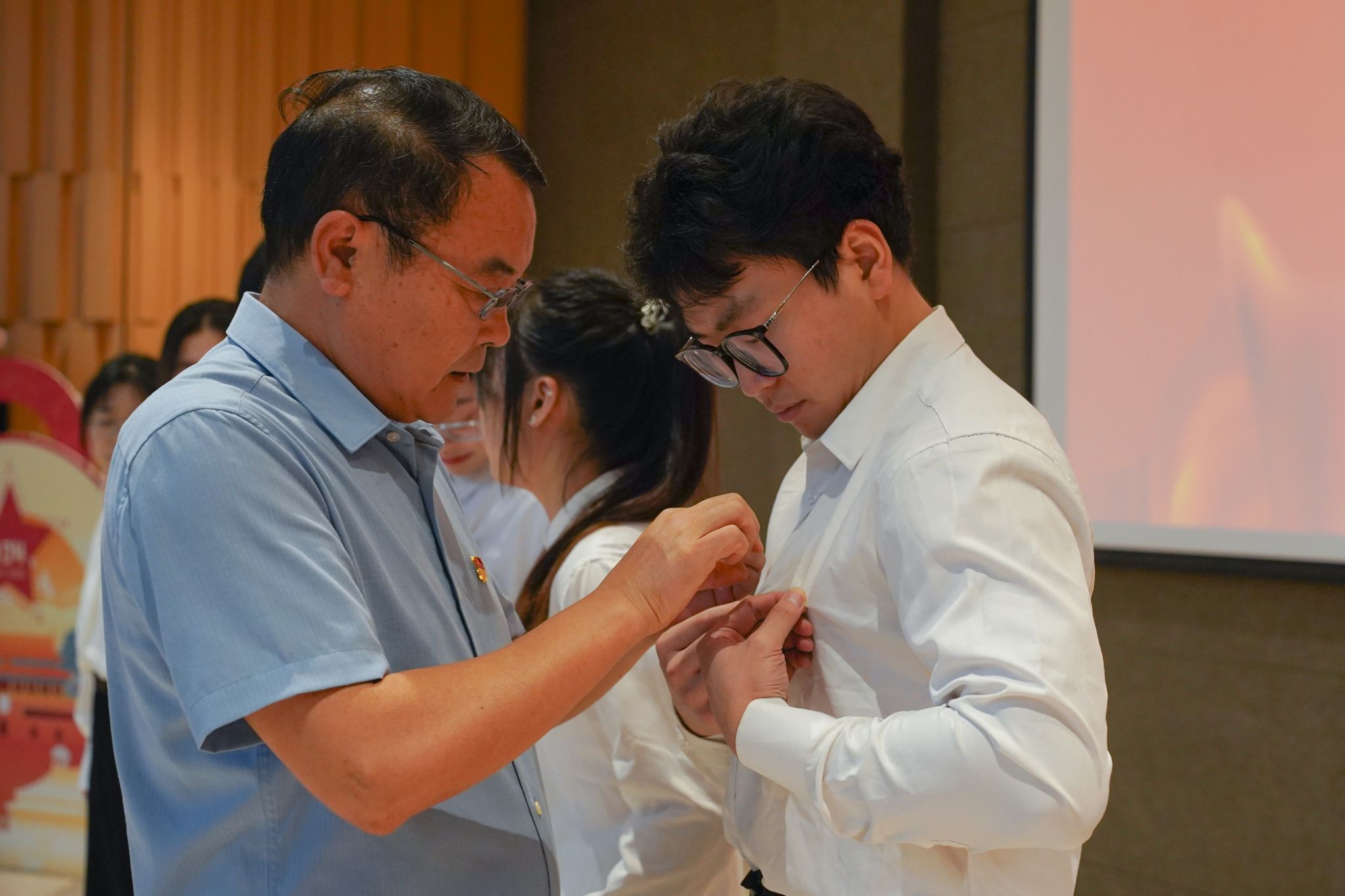 宣誓毕,由何先刚书记为新党员佩戴党徽。党徽在胸前熠熠发光,党旗在心中高高飘扬,新党员接过时代的接力棒,必当更加自觉履行党员义务,矢志不渝接续奋斗,用实绩践行忠诚,不负时代和人民重托!