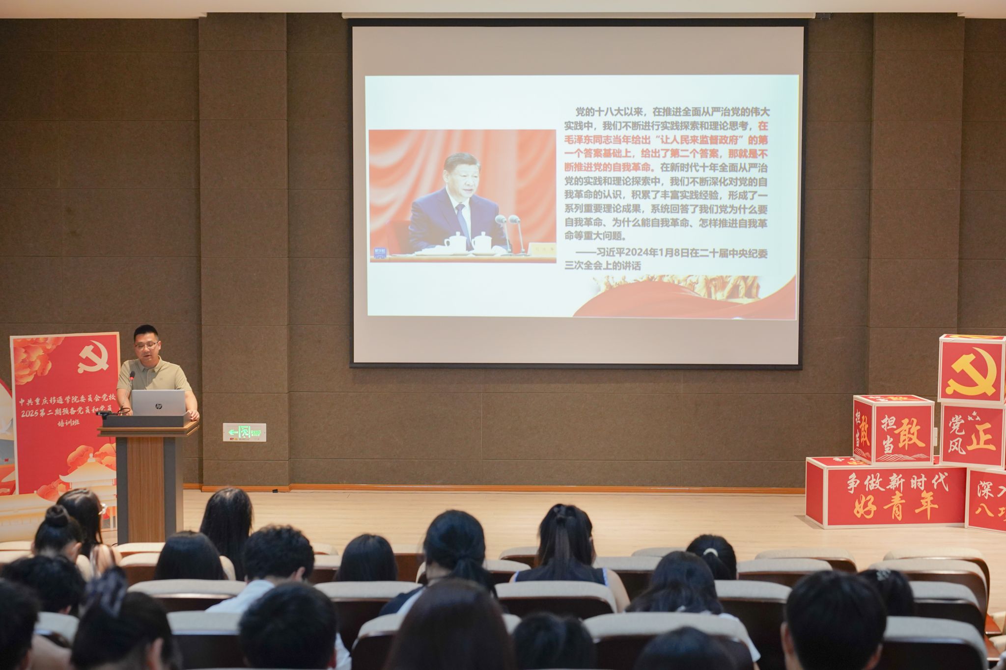马克思主义学院李阳老师以“党的建设是赢得革命胜利的重要法宝”为题,他强调要毫不放松坚持党的领导、加强党的建设。巩固拓展主题教育成果,扎实开展党纪学习教育,引导党员、干部真正把纪律规矩转化为政治自觉、思想自觉、行动自觉。一以贯之反对和惩治腐败,不断铲除腐败滋生的土壤,营造风清气正的政治生态。