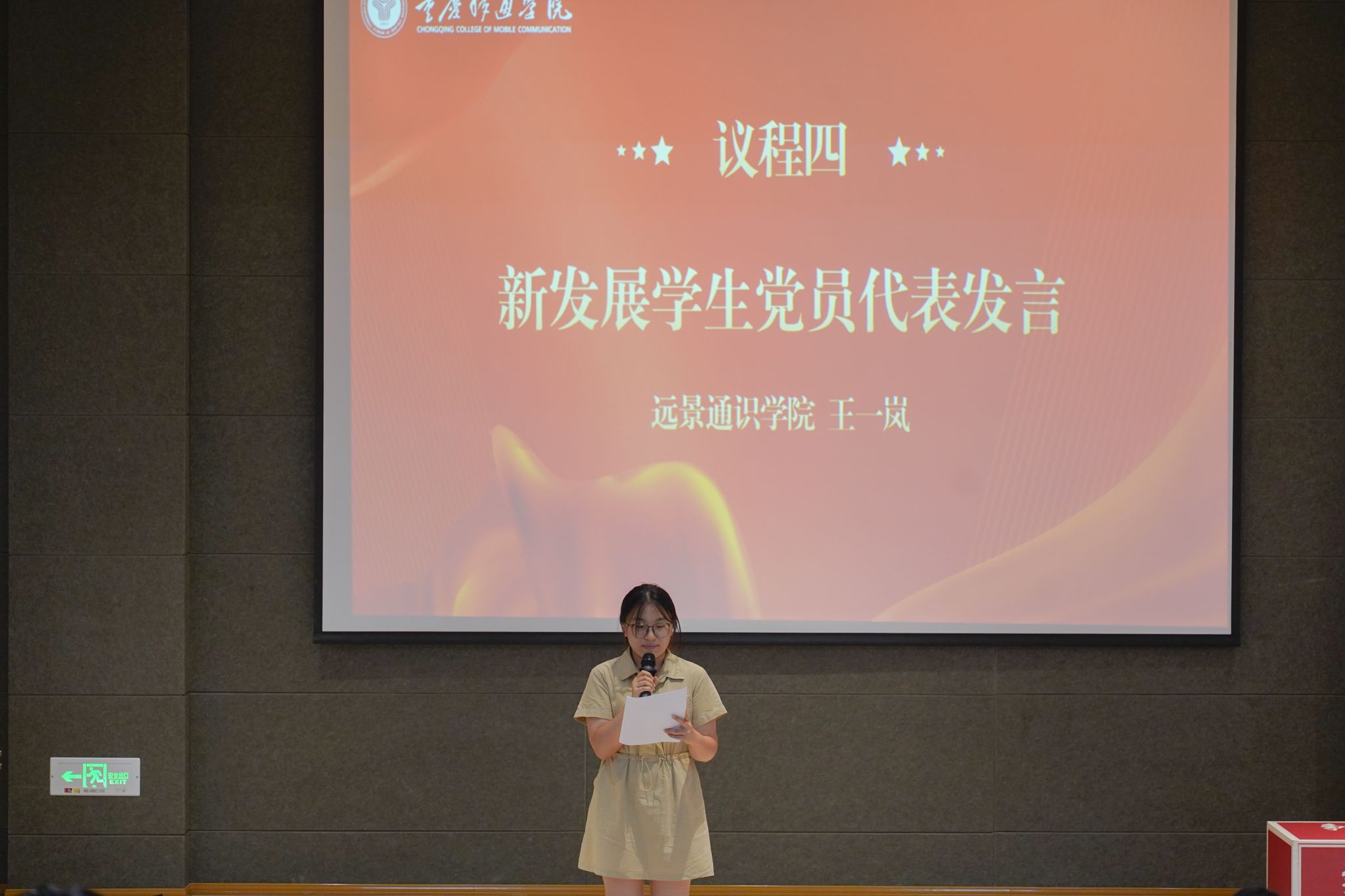 预备党员学生代表王一岚同志上台作发言,她表明在理论学习上,党员应深入学习贯彻党的二十大精神、习近平新时代中国特色社会主义思想,通过专题讲座、集中研讨等方式,不断强化政治意识和提升理论素养。要积极参加党团活动,认真学习党的理论,主动汇报思想动态,为党员成长奠定坚实基础。在实践锻炼中,党员应投身基层工作和服务群众的实践活动。