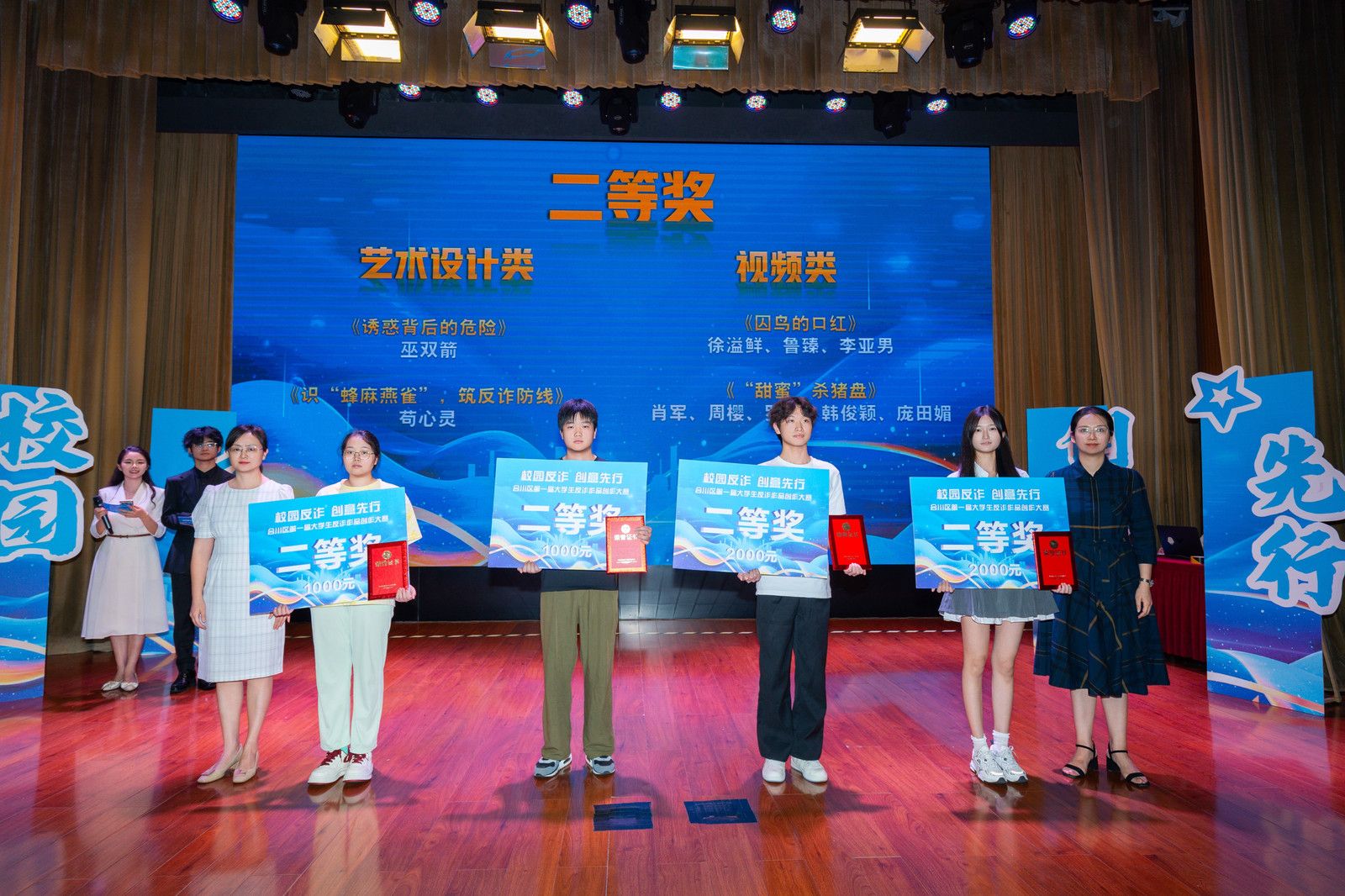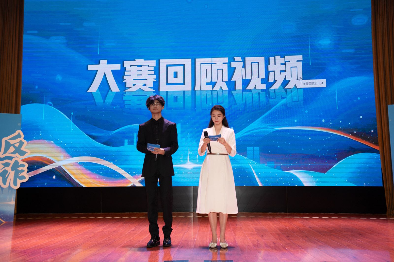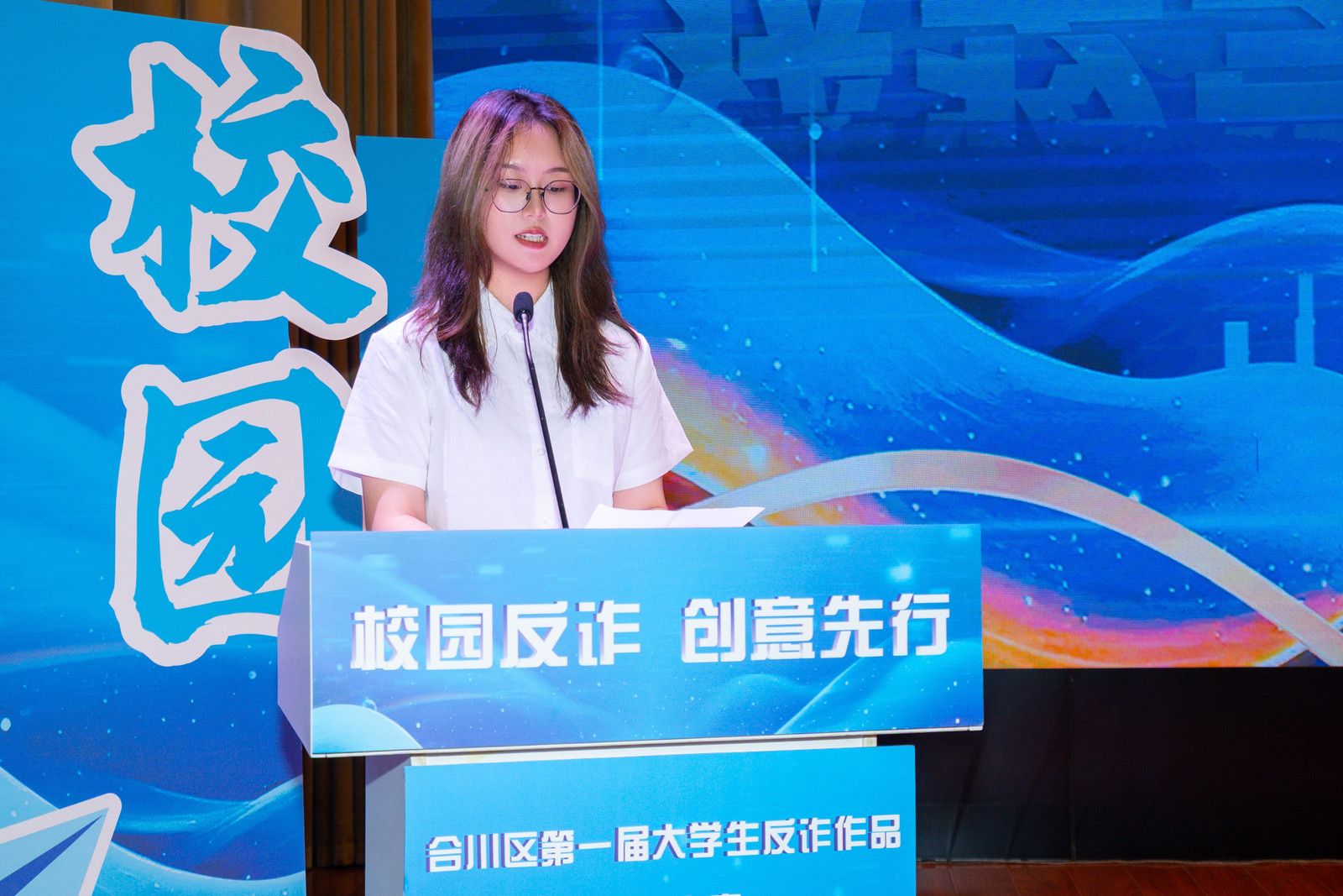 最激动人心的颁奖时刻,优秀奖、三等奖、二等奖、一等奖名单依次揭晓。来自重庆人文科技学院、重庆移通学院等多所高校的获奖代表满怀喜悦,依次走上领奖台。领导和嘉宾亲手为他们颁发荣誉证书,并合影留念,定格这荣耀瞬间。重庆人文科技学院徐新一同学和重庆移通学院林心雨同学作为获奖代表发言,他们娓娓道来作品的灵感来源与创作心路,字里行间尽显当代大学生参与反诈宣传的责任担当。