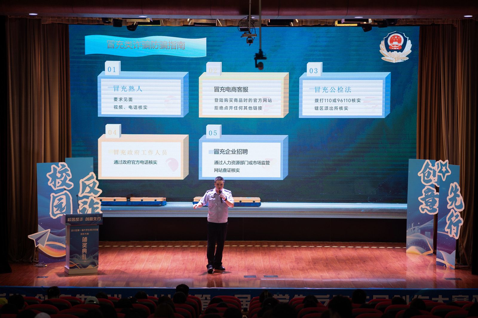 随着大赛回顾视频的播放,颁奖典礼正式拉开帷幕。视频中,那些充满创意的作品构思过程、创作者的专注神情,一一呈现,瞬间将观众带入充满激情与创意的反诈创作世界。紧接着,合川区公安局刑警支队新型犯罪侦查大队副大队长吴爽铭警官带来的反诈知识讲座,以真实案例为镜,深度剖析网络诈骗的惯用套路与防范要点,让反诈意识如春雨般浸润在场师生心间。
