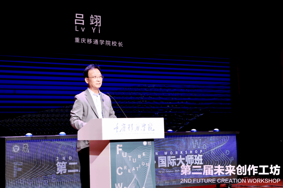 在与会师生与嘉宾的共同见证下,吕翊校长与中外导师代表共同登台,随着冰屏上倒计时的结束,他们一齐按下启动装置。刹那间,象征着无限创意与未来的光幕奔涌而出,第二届“未来创作工坊·国际大师班”在重庆移通学院正式启航。