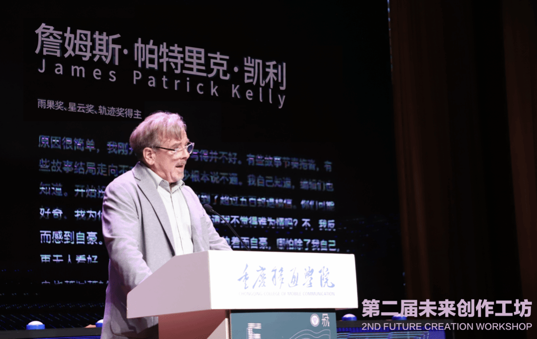 工坊客座校长James Patrick Kelly结合他的个人写作生涯,与在场青年创作者分享了关于坚持、成长与创作的经验和看法。James坦言,其写作之路始于频繁的退稿,最初的两年内收稿拒信超过五百封。他以此鼓励所有怀揣梦想的写作者,预言只要持续笔耕不辍,必将跨越瓶颈,不断接近并创造出属于自己的“最佳作品”。他强调,成为一名“艺术家”并非头衔的授予,而是在这漫长而执着的实践中自然抵达的状态。