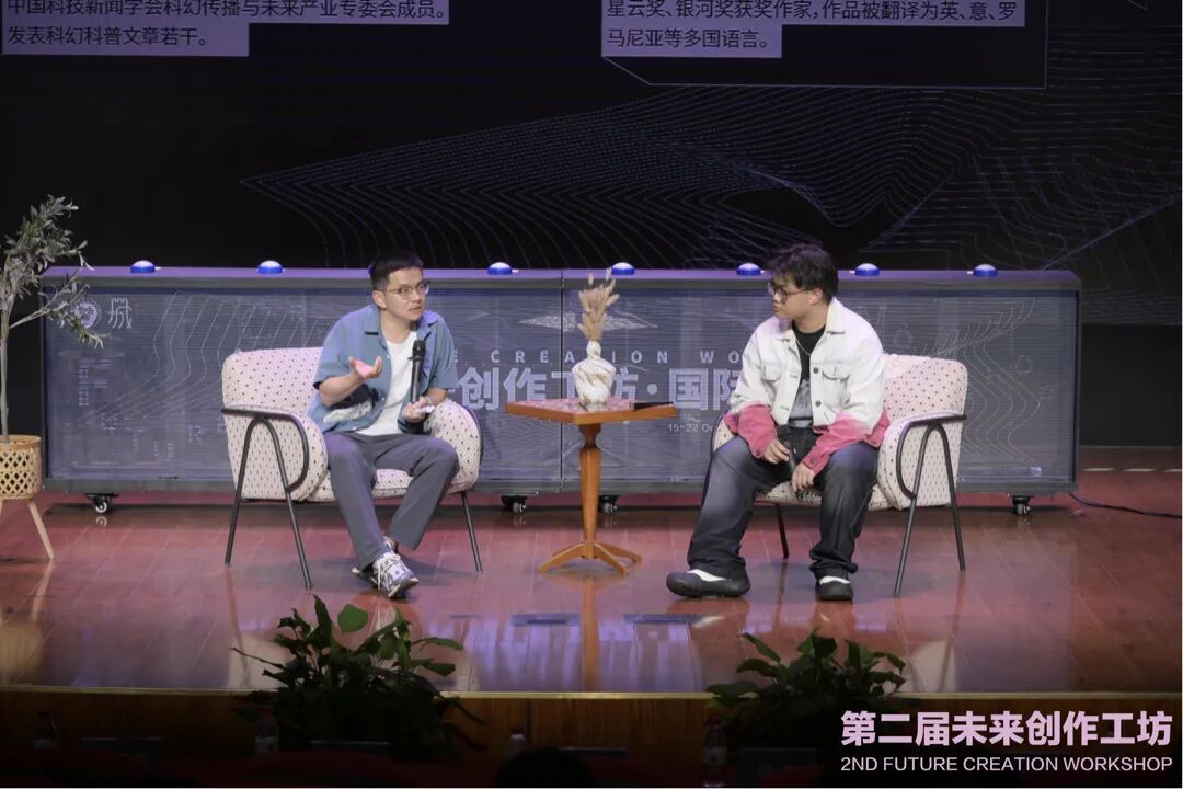 对谈伊始,阿缺老师首先汇报了首届未来创作工坊学员与导师在过去一年里取得的丰硕成果。他提到,首届学员中,李图野凭借作品荣获今年冷湖奖“最佳中篇小说”;路航获得了星云奖“最佳新星”并已出版个人作品;南姝羽、赵浔与张瑞本人在内的多位学员获得了星云奖青少年科幻征文(大学组)奖项。同时,首届导师团队也持续活跃于创作一线,佳绩不断:张冉(太古科幻学院院长)的作品《止水》荣获星云奖与银河奖双料大奖;钓鱼城科幻学院E伯爵老师获得银河奖;段子期老师的作品发表于《十月》《花城》等知名刊物,其《倍速世界》还入选了上海电影节改编论坛,并即将角逐天问奖最佳短篇小说奖。阿缺强调,这共同构成了首届工坊“教学相长、共同闪耀”的生动图景。