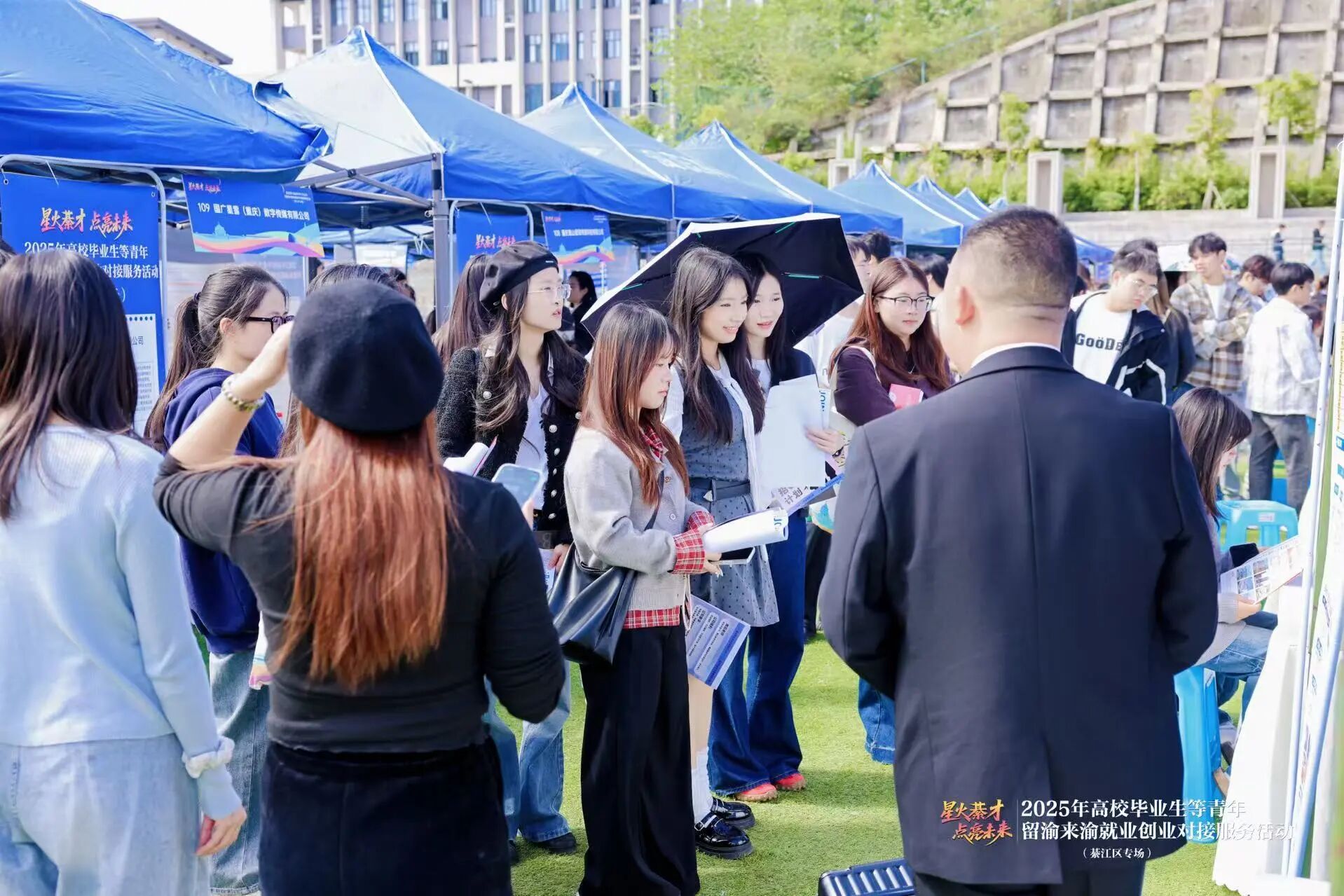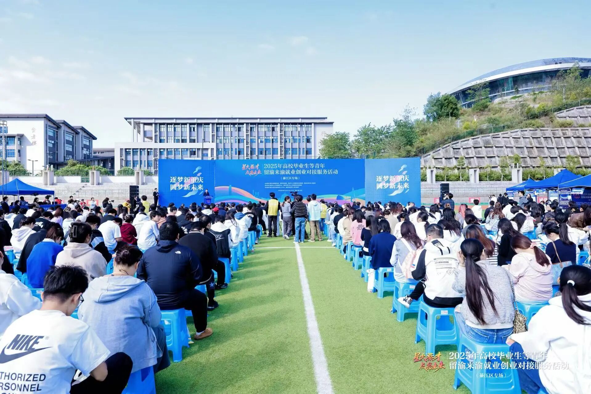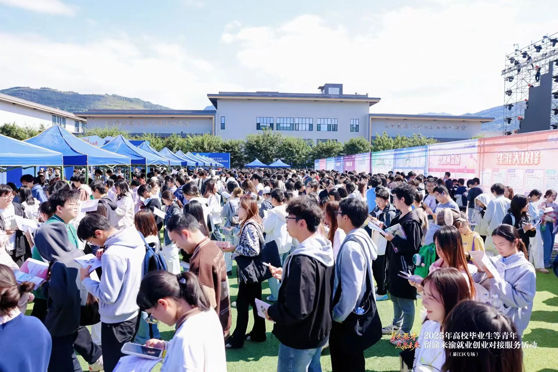 10月23日上午,由重庆市人力资源和社会保障局、重庆市教育委员会、重庆市财政局、重庆市綦江区人民政府共同主办,重庆市人才交流服务中心、綦江区人力资源和社会保障局承办,重庆移通学院协办的“逐梦新重庆、圆梦新未来——星火綦才·点亮未来”2025年高校毕业生留渝来渝就业创业对接服务活动(以下简称“对接服务活动”)、重庆移通学院2026届毕业生秋季大型双选会(第二场)、綦江校区第四届生涯游乐园在重庆移通学院(綦江校区)田径场顺利举行。