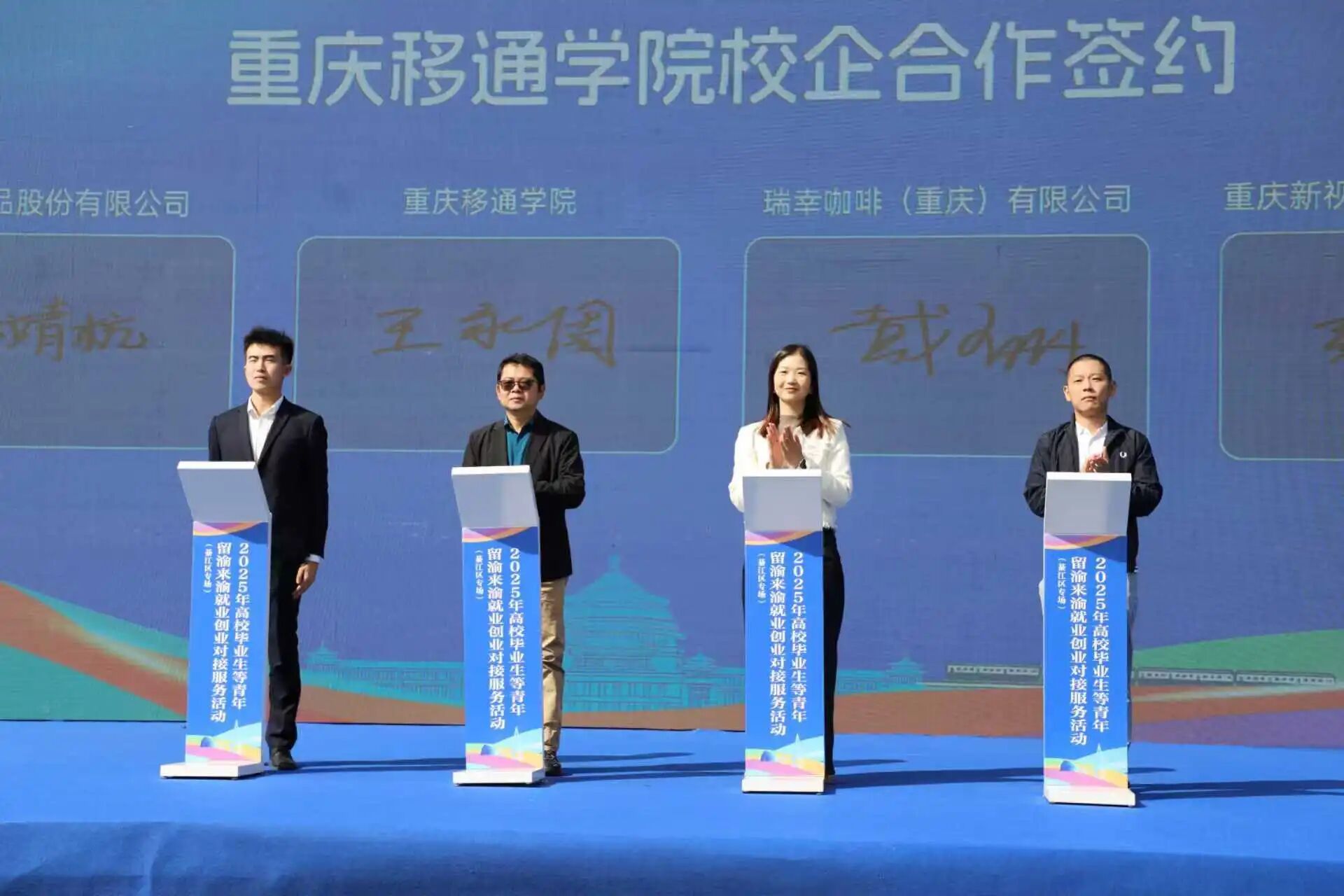 活动现场还进行了三轮签约仪式。其中首轮签约仪式中,重庆移通学院与牧原食品股份有限公司(企业代表为入职仅一年的重庆移通学院2024届校友孙靖杭)、瑞幸咖啡(重庆)有限公司、重庆新视通智能科技有限公司签署战略合作协议。