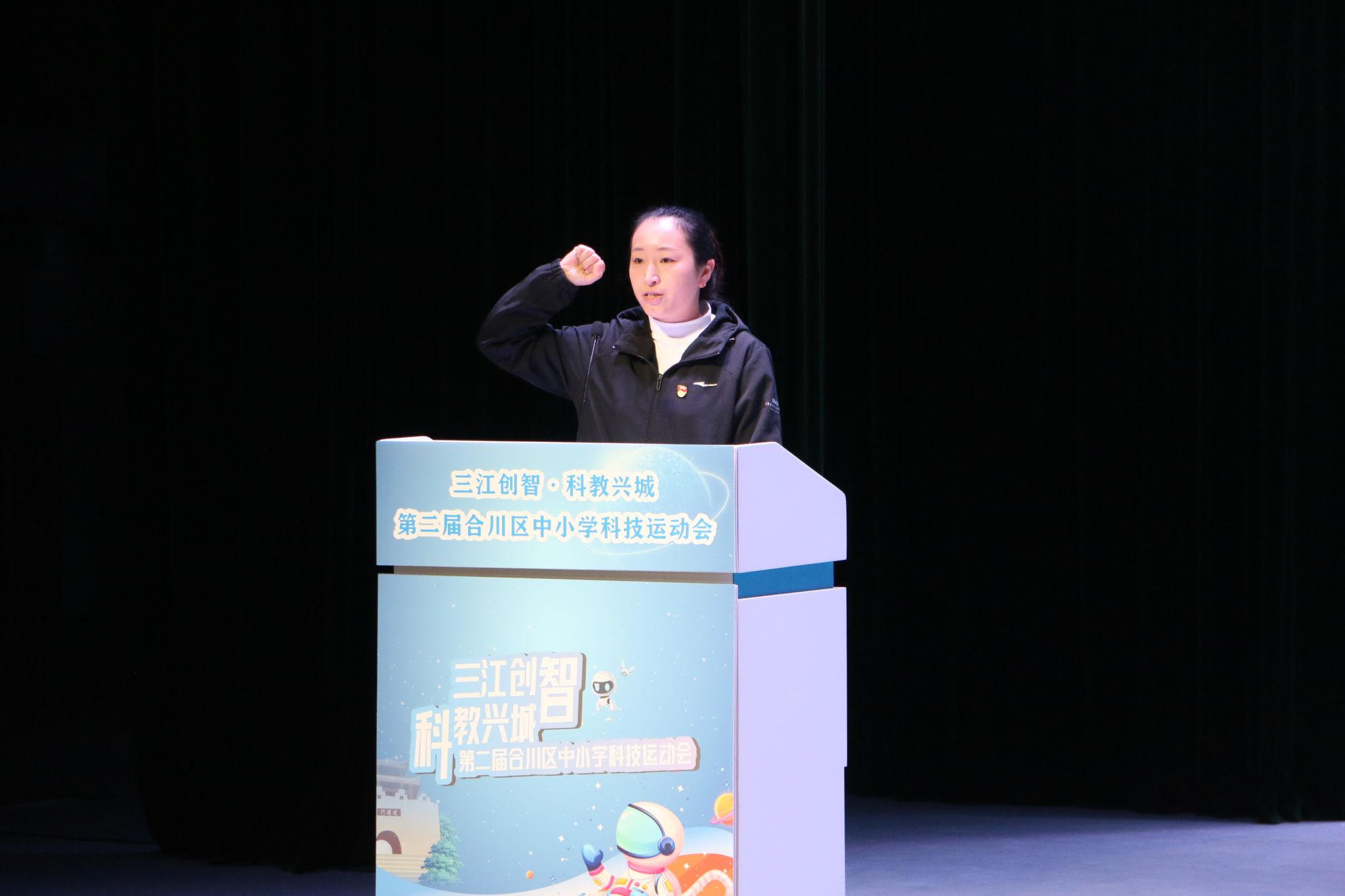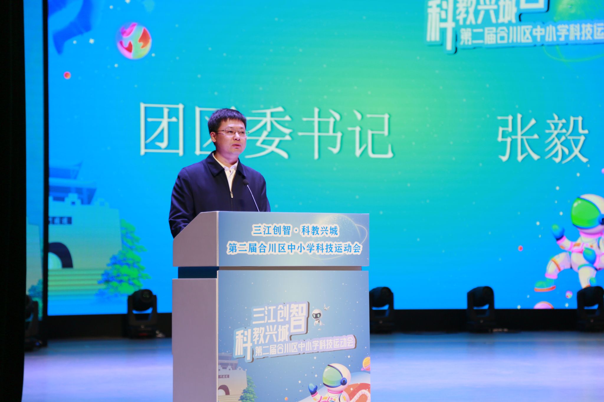 重庆移通学院校长助理刘枚登台致辞,表达对青少年科创事业的期许与支持。随后,团区委书记张毅登台发言,他寄语广大青少年珍惜此次科创实践的宝贵机会,以好奇心为翼、以坚持为舵,在探索中突破自我,在协作中共同成长,争做敢想敢试、勇于创新的新时代科技追梦人。区政协副主席罗杰表示,科技已成为融入青少年学习生活的必需品和未来竞争力的关键基石,合川区举办科技运动会契合青少年发展中长期规划与时代潮流。他提到,赛事整合多方资源,新增贴合科技趋势的项目,为青少年搭建了交流学习、挑战自我的平台,鼓励同学们在实践中感受科技魅力、锤炼科学素养,以热爱与好奇书写青春精彩,成长为适应未来社会的创新人才。至此,本次科技运动会正式拉开序幕,全场掌声雷动。