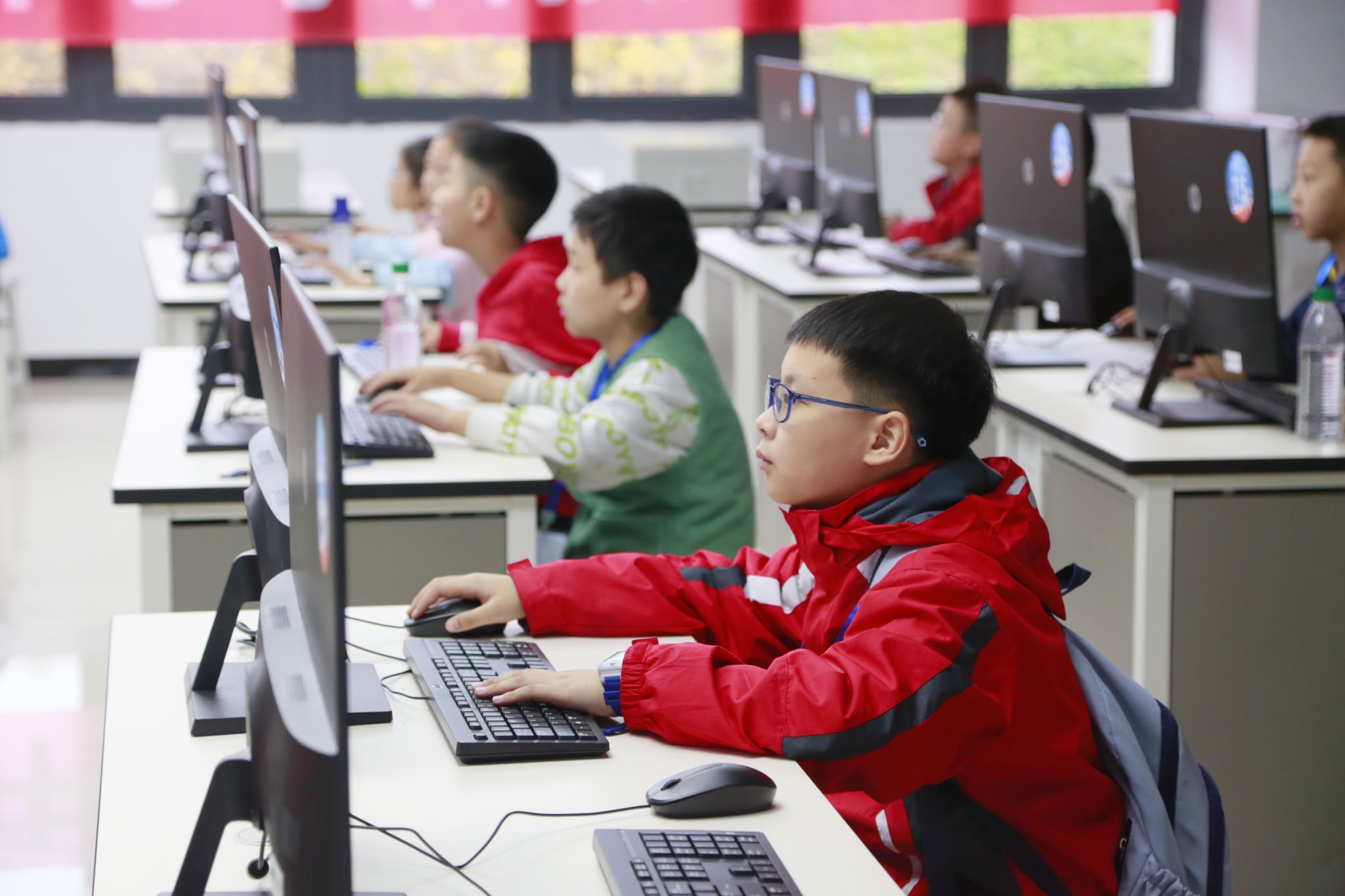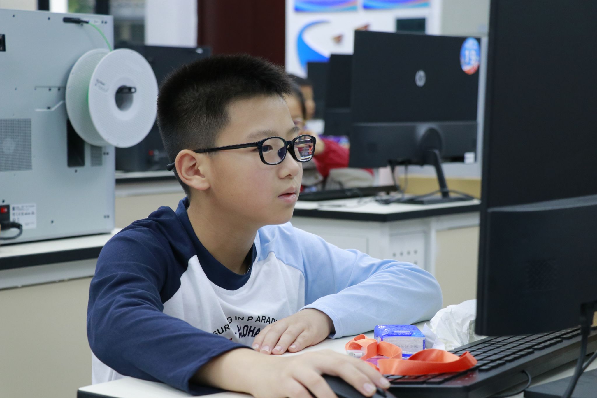 与此同时,双栀书院计算机教室内,软件类赛事的节奏同样紧凑:机器人挑战赛的屏幕上,虚拟机械臂精准完成指令动作;编程挑战赛的键盘敲击声里,算法逻辑正转化为流畅运行的程序,键盘敲击声此起彼伏,指尖在键帽上灵动跳跃,屏幕上代码飞速流转、创意火花持续闪现,从算法优化到程序开发,从界面设计到功能实现,多维度展现着当代青少年扎实的科创实践功底与不受边界束缚的天马行空想象力。