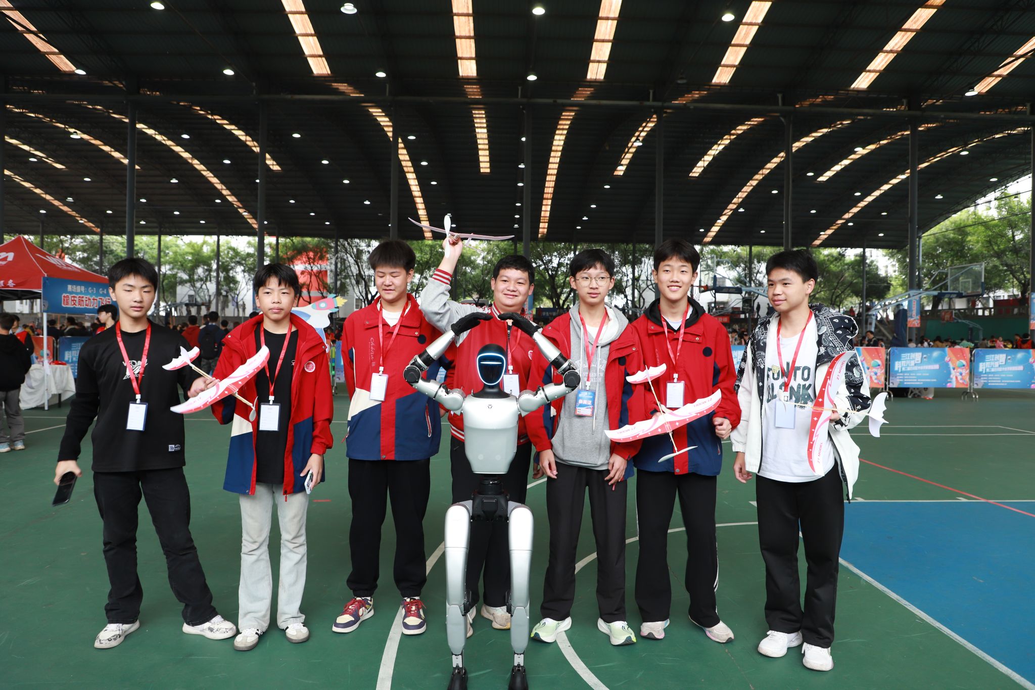 开幕式后,两大场地同步开启科创盛宴,将科创氛围推向热潮。在重庆移通学院风雨球场内,合川区中小学科技运动会工作展与AI绘画普及赛作品展并肩亮相,各类充满巧思的科创成果让人目不暇接:前者铺展着区域科创实践的脉络成果,后者的画作里满是科技与艺术碰撞的奇思;赛场一侧,橡皮筋动力飞行普及赛的选手们正微调机翼角度,无人机挑战赛的飞行器在半空灵活穿梭,机器人与硬件编程赛事的操作台边,零件拼接、代码调试的动作此起彼伏,选手们屏气凝神、沉着操作,指尖翻飞间调试设备,眼神专注中校准参数,每一个动作都承载着反复打磨的积累,每一次尝试都彰显着青少年对科技未知的执着探索。