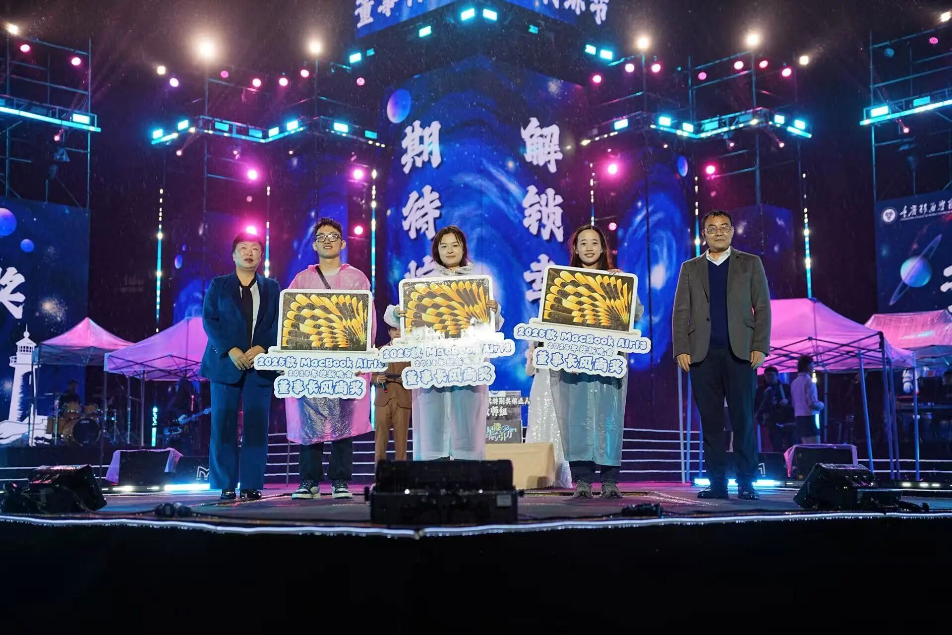 演出间隙,备受瞩目的“董事长特别奖”在热烈的氛围中依次揭晓,在綦江区人民政府副区长陈贤,区人大常委会副主任陈正科,重庆移通学院校长吕翊,党委书记、政府督导专员何先刚的公布下,3名教职工荣获“董事长风尚奖”,分别获2025最新款mac book air13一台;5名学子摘得“董事长闪耀奖”,分别获Apple iPad air 11英寸一台;2名同学则中得“董事长星耀奖”,赢得包含iphone17 pro max, apple watch series11以及AirPods Pro 3在内的豪华Apple礼包!