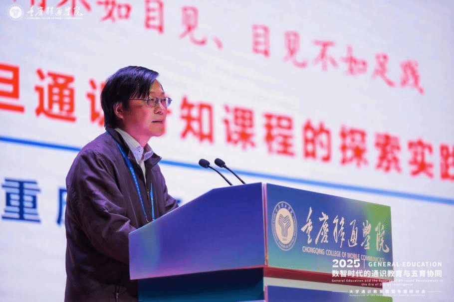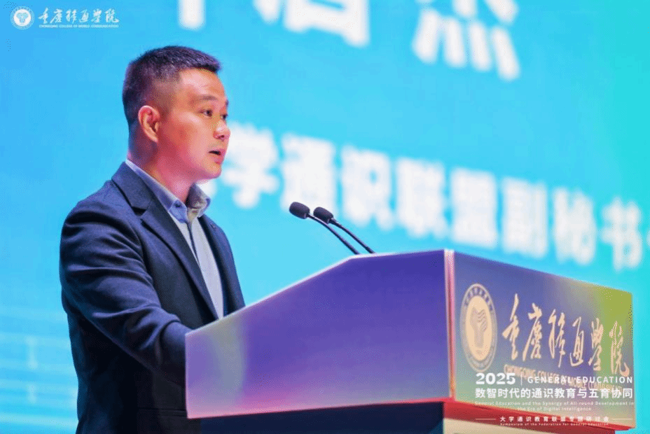 重庆移通学院党委书记、政府督导专员何先刚致辞。他指出,在人工智能、大数据等技术深刻重塑社会形态的今天,通识教育作为人才培养的基石,其价值愈发凸显。而如何培养面向未来的新人,是所有教育工作者,要共同回答的重要课题,学校已将通识教育纳入核心培养体系,构建了六大课程板块,并通过“教学-活动-反馈-改进”闭环持续提升教学质量。