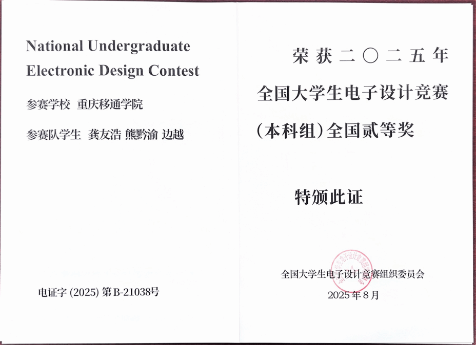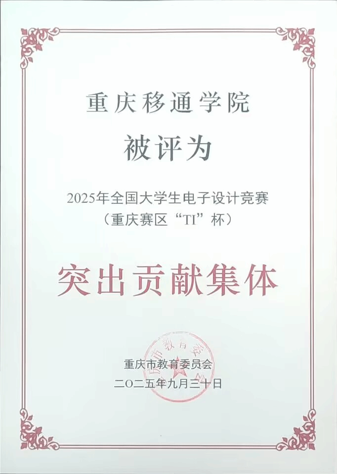 近日,由重庆市教育委员会主办的2025年全国大学生电子设计竞赛(重庆赛区“TI”杯)获奖名单正式公布。重庆移通学院通信与信息工程学院智能信息技术教研室积极组织、全力备赛,共派出26支参赛队伍投身激烈角逐。经过专家评审与多轮公示,学校最终荣获2025年全国大学生电子设计竞赛(本科组)全国二等奖1项、重庆市一等奖2项、重庆市二等奖3项的优异成绩,展现出扎实的专业功底与突出的创新能力。同时,学校还获评“突出贡献集体”荣誉称号,实现了团队成绩与组织荣誉的双丰收。