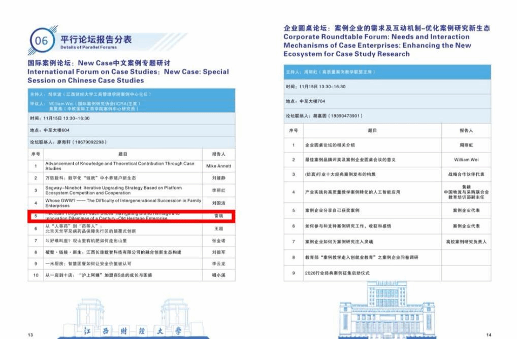 雷瑞老师作为受邀嘉宾汇报了《合川同德福桃片:百年老字号的品牌传承与创新抉择》的案例研究。该案例聚焦重庆合川同德福桃片这一百年老字号企业,剖析其在新时代下面临的品牌传承与创新抉择,探讨传统中小企业的价值重塑与可持续发展,为中小企业如何在坚守传统与拥抱变革之间寻求平衡点提供了案例教学启示。案例汇报后,北美案例协会(NACRA)副主席、国际案例研究协会(ICRA)主席魏小军教授与中欧国际工商学院案例中心研究员黄夏燕博士作为评议专家,对案例进行了综合性点评,并提出了针对性建议。