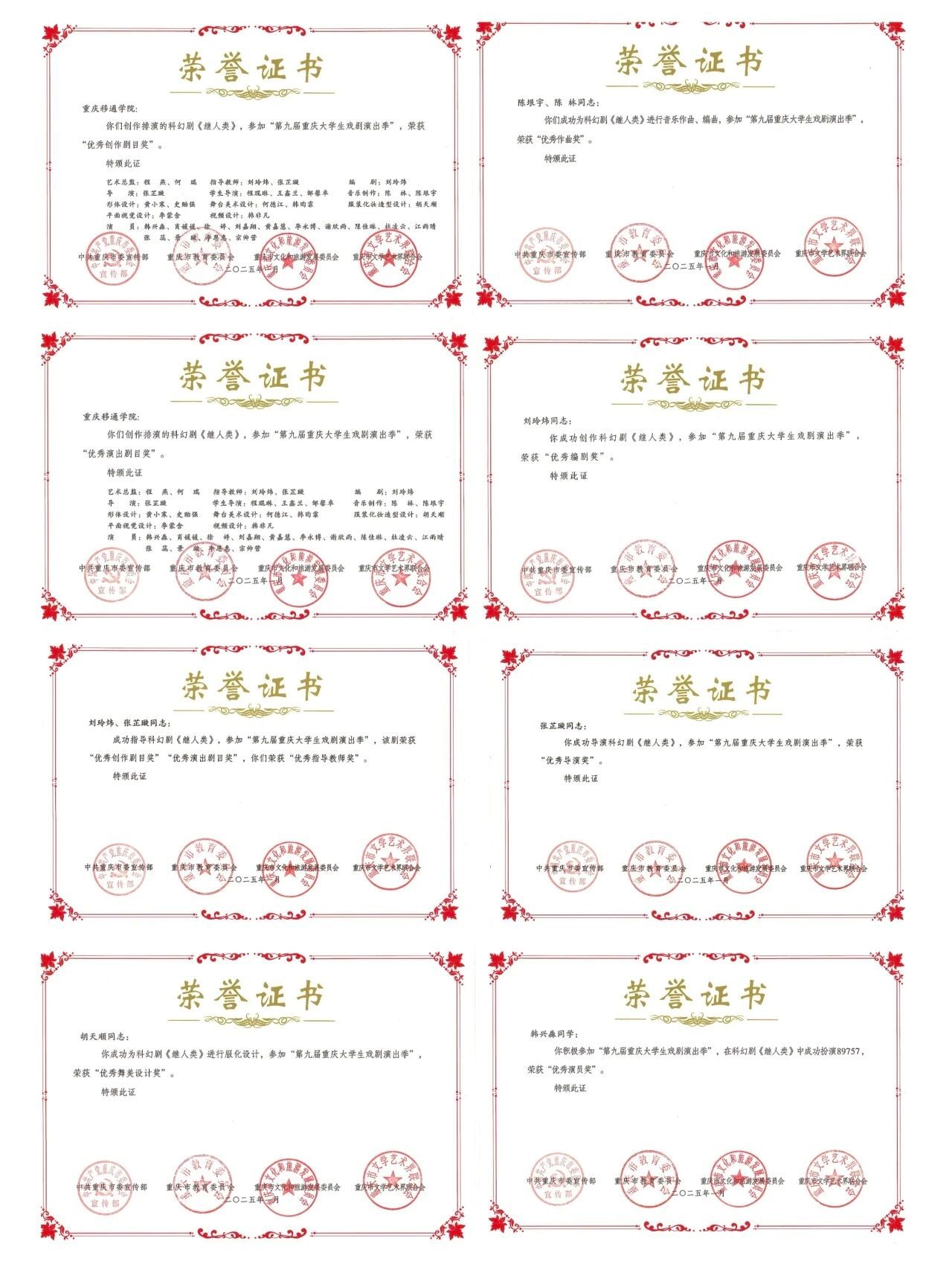 此前,《继人类》已在第九届重庆大学生戏剧演出季中包揽优秀创作剧目奖、优秀演出剧目奖等多项大奖,并先后受邀赴浙江大学交流演出,入围“重庆市渝本计划”,荣获“首届百万钓鱼城科幻大奖最佳舞台剧奖”。此次再获“金刺猬”肯定,标志着我校“科幻+艺术”融合育人模式初见成效。