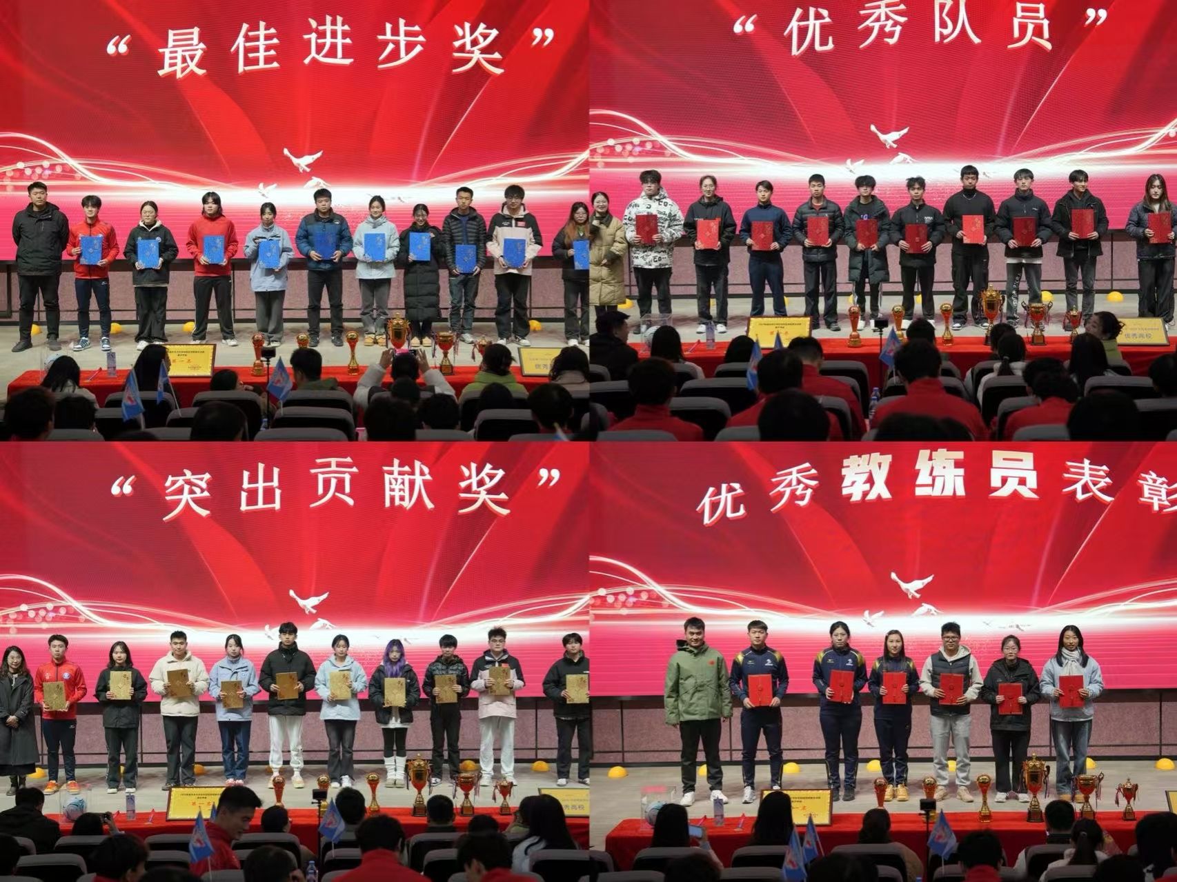 在表彰环节中,学校为表现优异的队员们颁发了:学期进步奖、突出贡献奖、优秀队员奖等多个奖项,到场嘉宾们带着满满的期许与鼓励,为获奖者颁发了奖励并合影留念,每一个奖项都饱含着深切的关怀与支持,同时,竞技体育中心江华副主任向六名教练员授予了优秀教练员证书。这些奖项不仅是对他们努力和成绩的肯定,也是激励他们继续前行的重要动力。