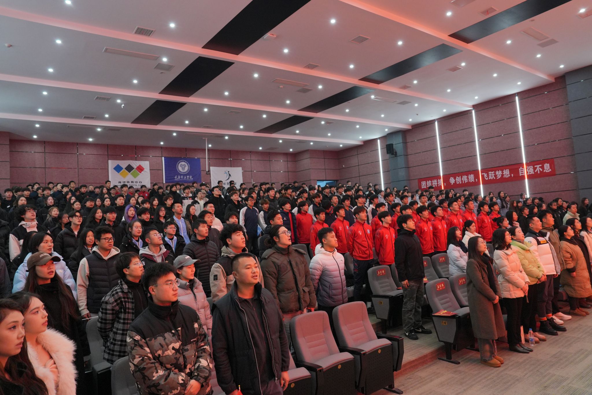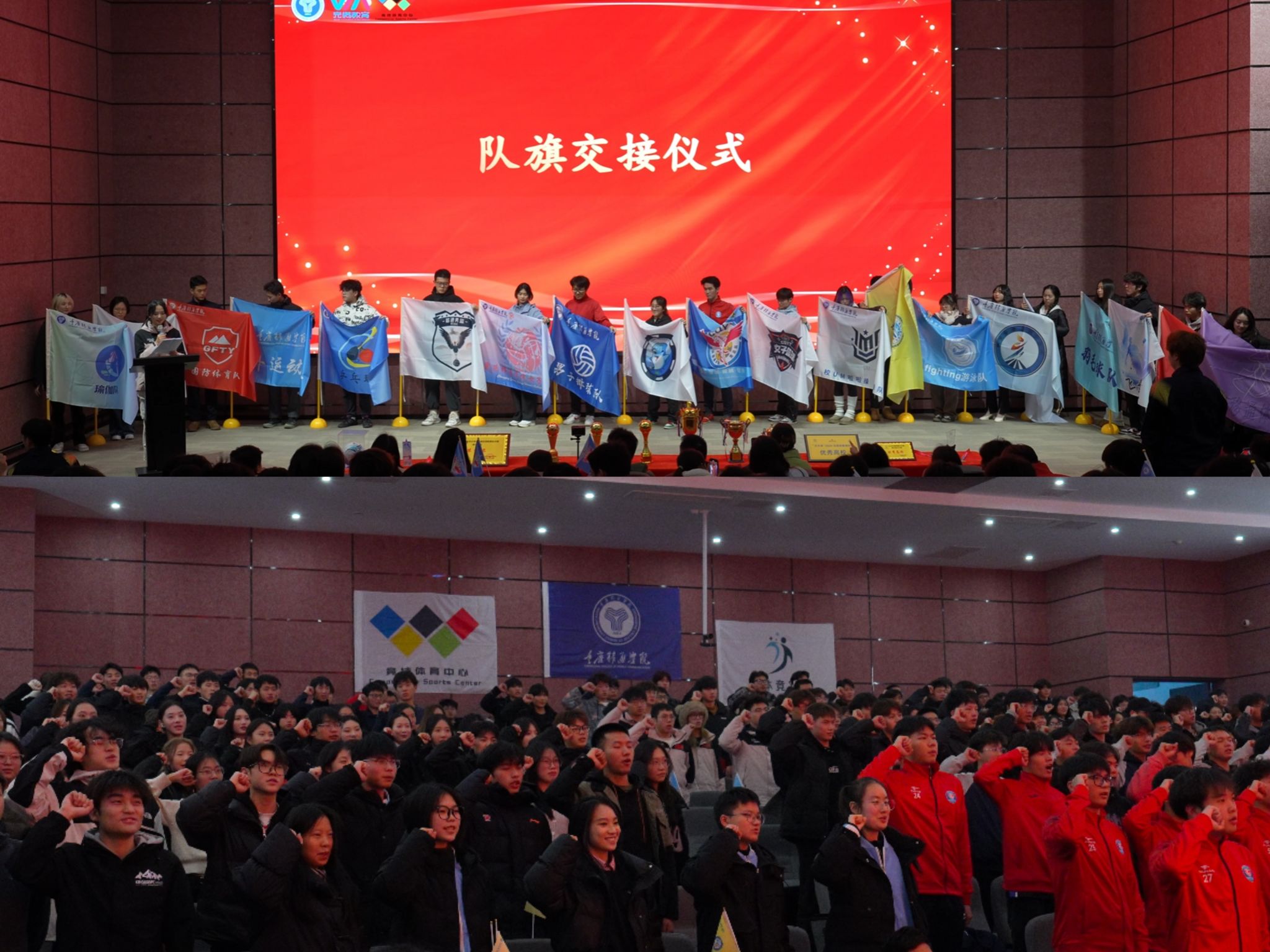 仪式半场之际,进行了一场庄严肃穆的队旗交接仪式。教练、队长与新队员代表依次交接队旗,见证着这一重要的历史时刻。随后,由苏世达教练领誓,台下全体校队成员起立,宣誓的同时,新队员们展示着手中的校队旗帜,誓言为校队的荣誉拼搏奋斗。