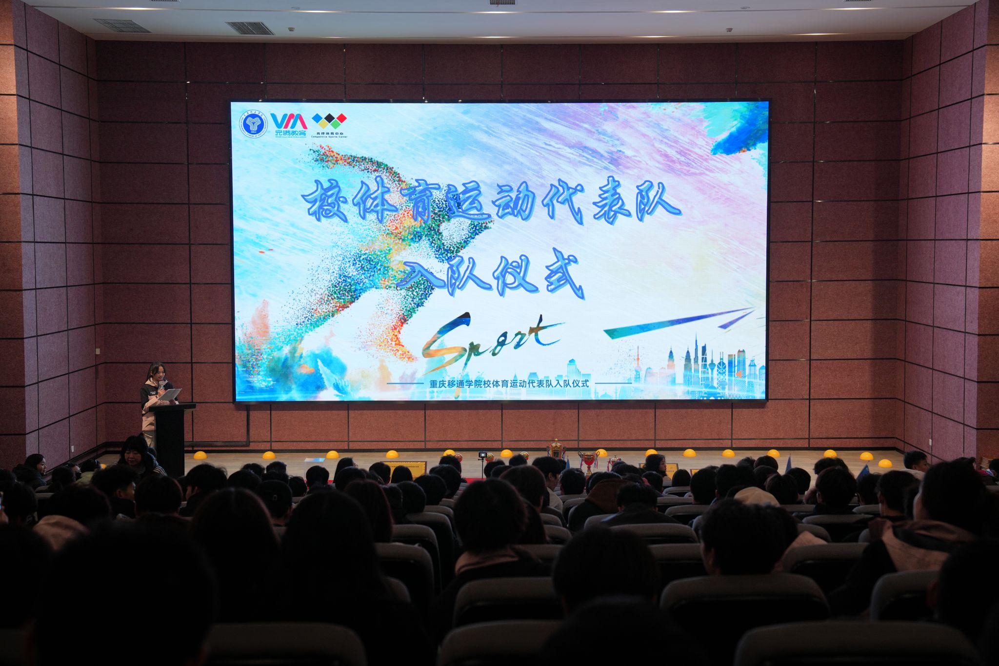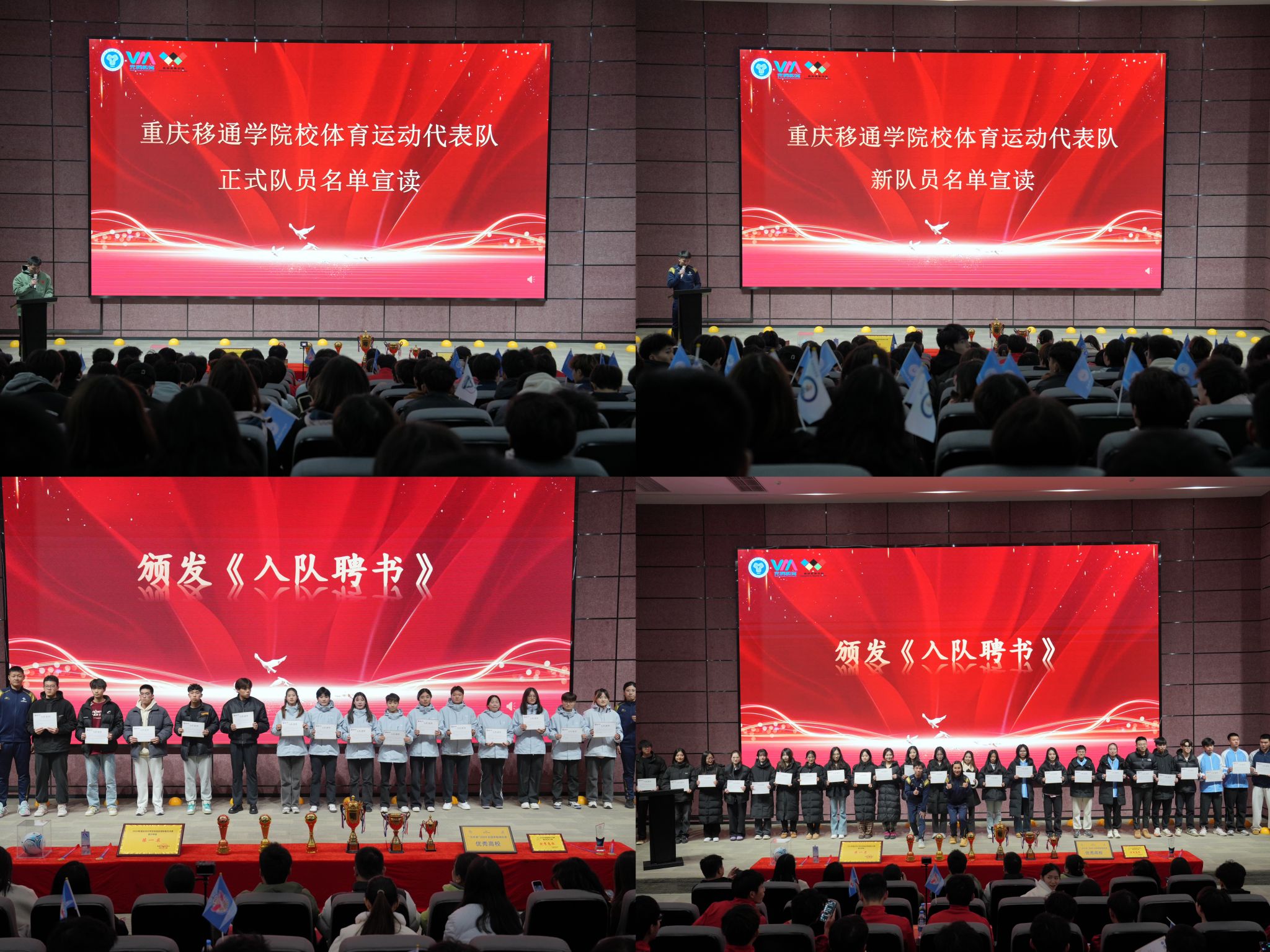在全场热烈的掌声中,竞技体育中心的江华副主任宣读了新一届校队正式队员名单,罗晨组长宣读校队新队员名单,并让每两个队伍的新队员上台领取由各自教练颁发的入队通知书,大家一起合影留念,标志着他们正式成为校队一员。满怀激动与自豪,各队伍代表带领队员用响亮的口号和整齐的队列展示队伍的精神风貌,充分彰显校队凝聚力、向心力、对卓越成绩的追求决心。