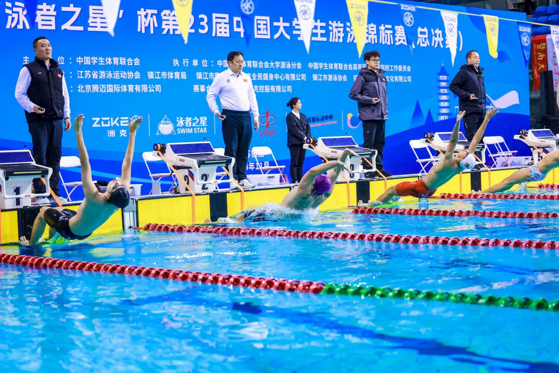 2024年11月27日,由中国学生体育联合会主办的第23届中国大学生游泳锦标赛总决赛在镇江体育会展中心综合训练馆开幕。比赛从26日——30日,为期5天,设有185个项目、302枚金牌,共吸引了来自清华大学、北京大学、北京工业大学、上海交通大学、复旦大学、北京体育大学等150所高校的1470名运动员、教练员集聚镇江。同时本次比赛吸引了众多高手前来参赛,包括奥运冠军选手杨浚瑄,全运会冠军彭旭玮,国家队队员费立玮、洪金权等游泳名将,游泳水平、参与高校、人数较往年相比都再创新高。