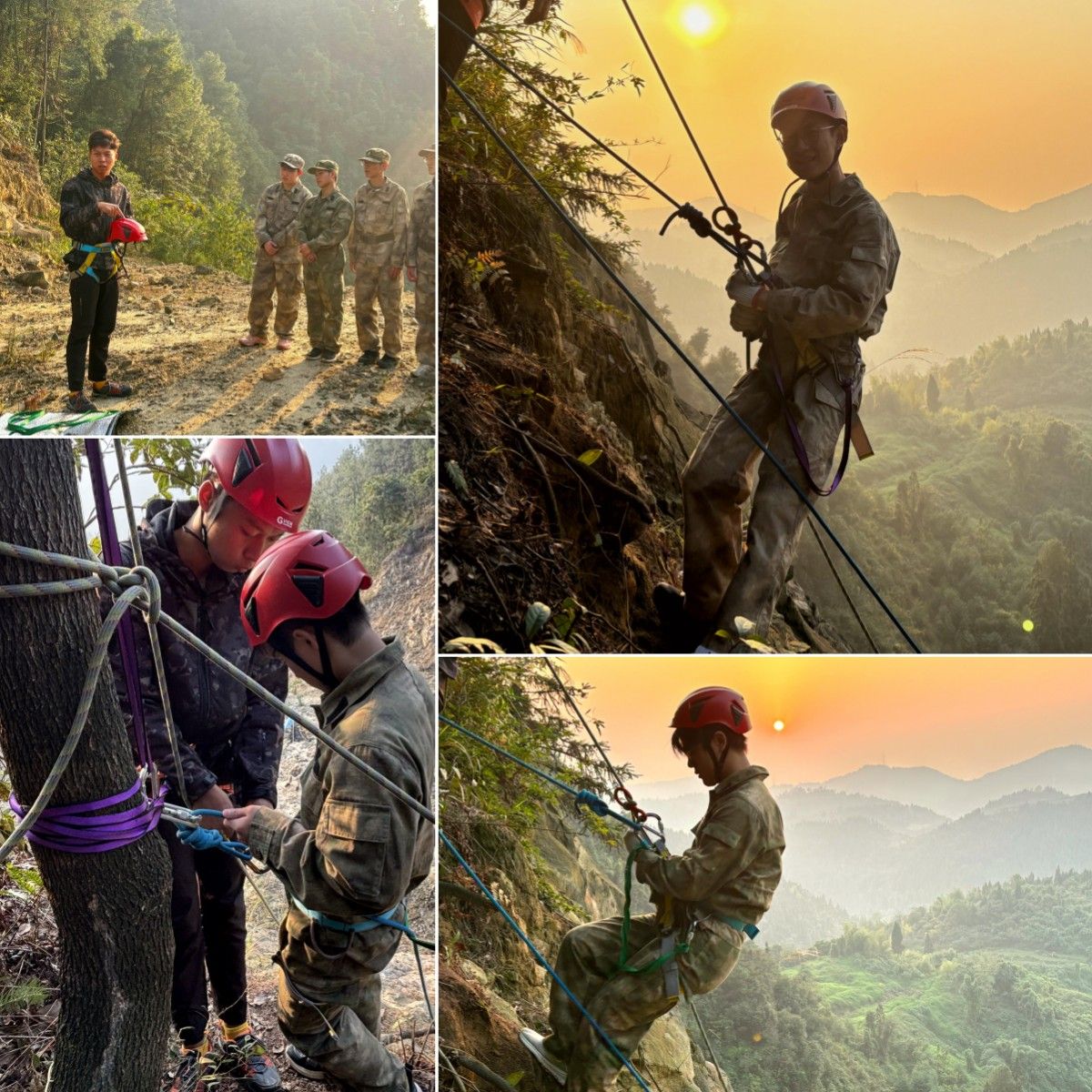 在建文峰攀登过程中,学员们相互鼓励,克服困难,坚韧不拔,成功登上巴南第一峰建文峰。峰巅处,数十米、几乎垂直的峭壁,王阔教练早已布置好了崖降场地,这将是学员们勇气与自我突破的试炼场。在教练的指导、队友的加油呐喊下,学员们克服内心恐惧,勇敢迈出第一步,在空中感受风的力量,体验“峭壁逢生”的刺激。