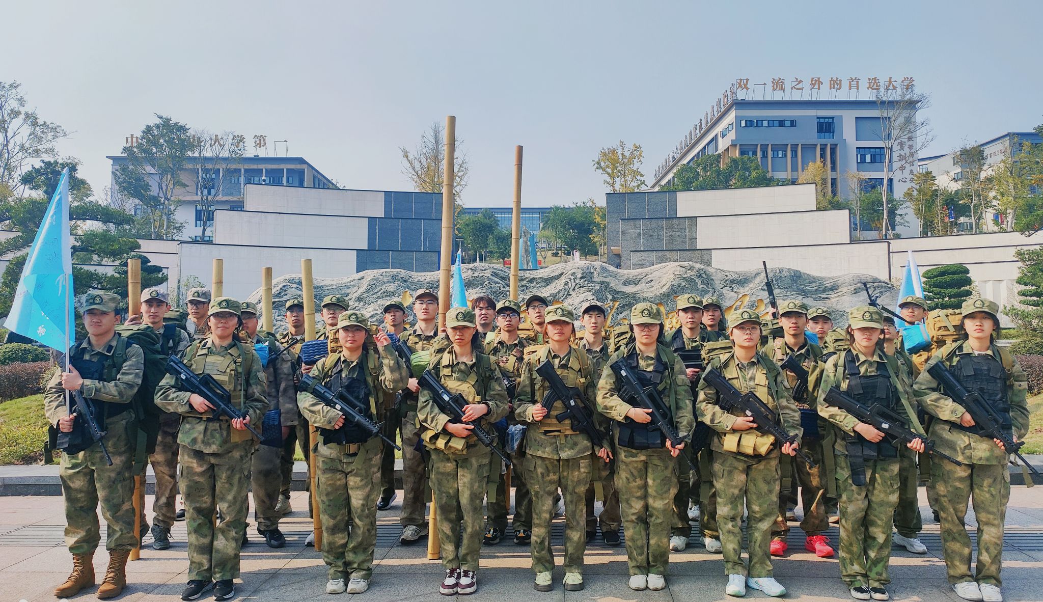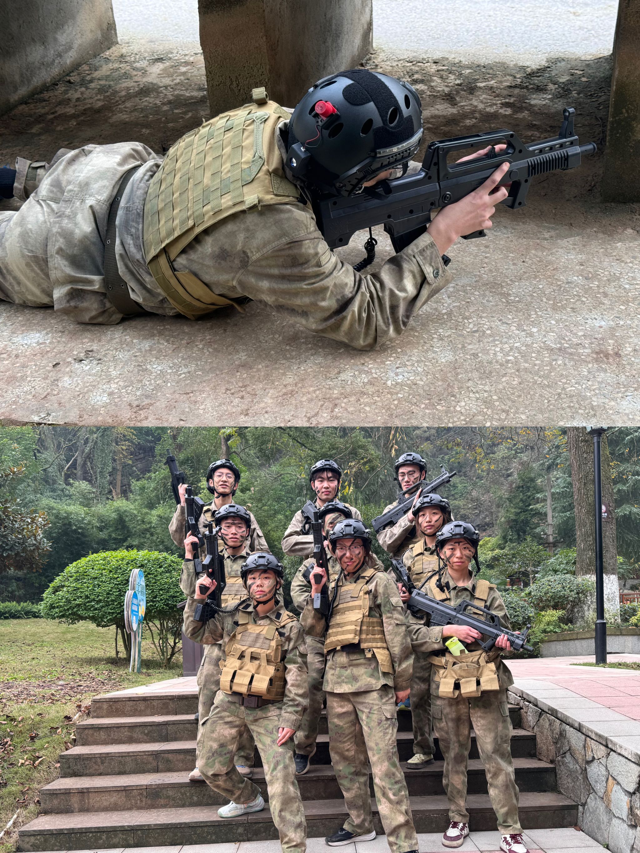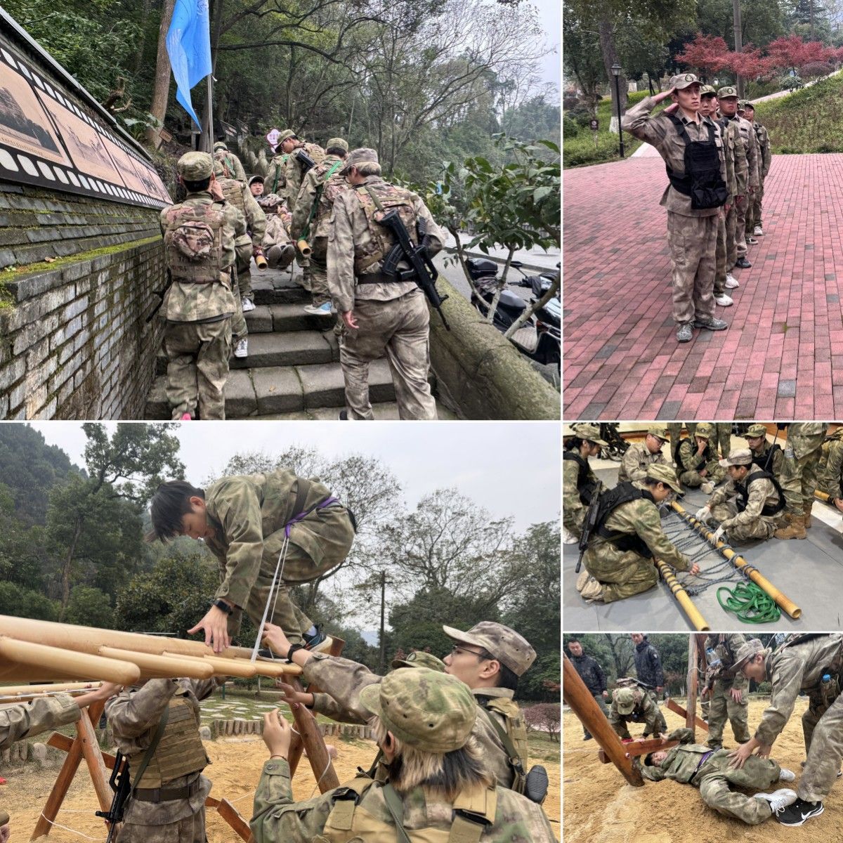 十中记忆公园,从容不迫的指挥,整齐划一的动作,学员们在九龙墙前自行组织队列训练。制作担架,对伤员进行极速救援,还面对复杂的绳索结构和有限的时间限制,沉着应对、共同协作,完成绳索脱困。这些项目既是对学员领导力的培养,也是整个团队的深入熔炼。而后的真人CS项目更是将团队协作展现得淋漓尽致:每一次战术讨论、精准射击、成功掩护与围歼救援,都让学员们深刻理解到团队精神的重要性。