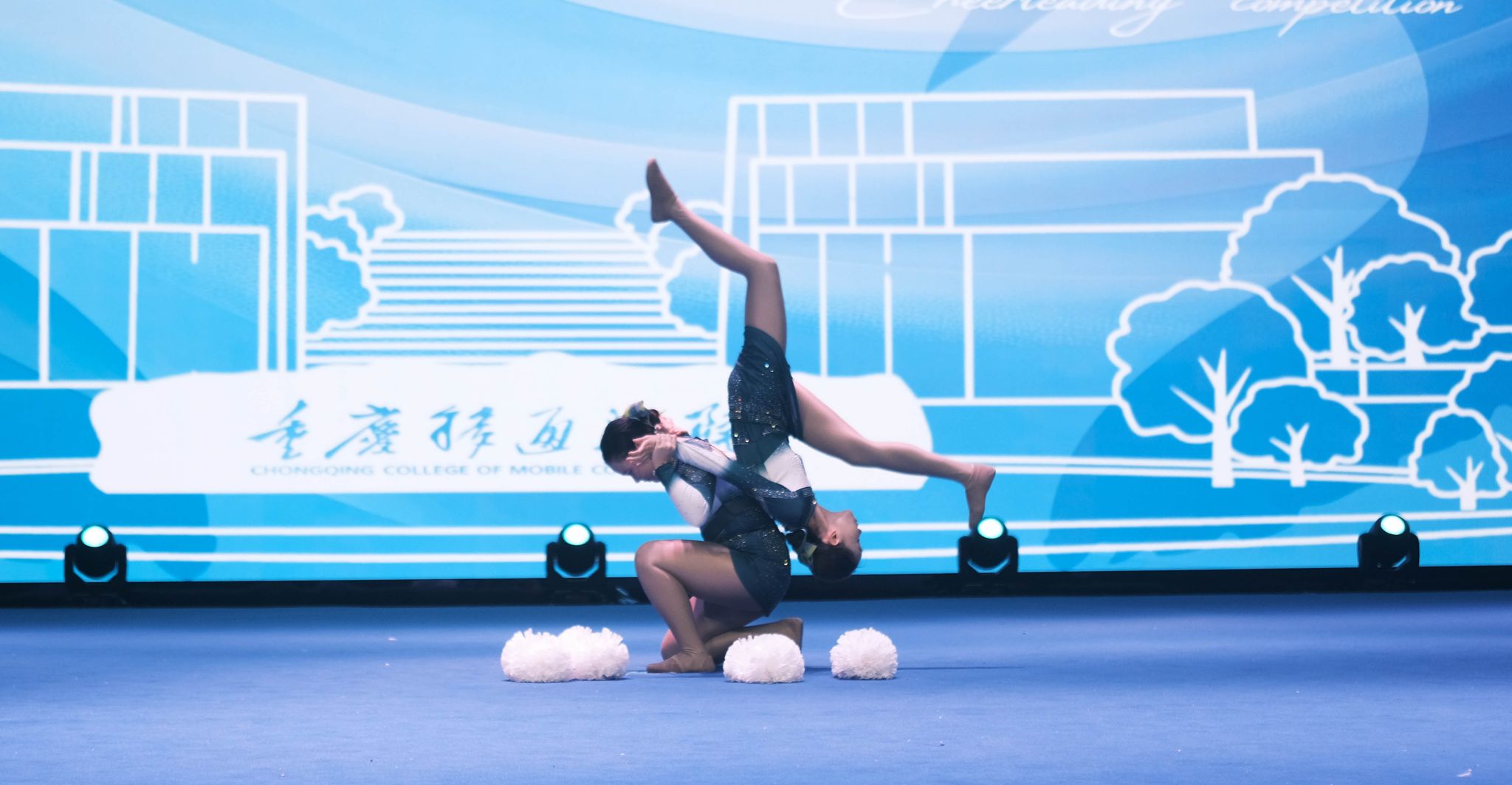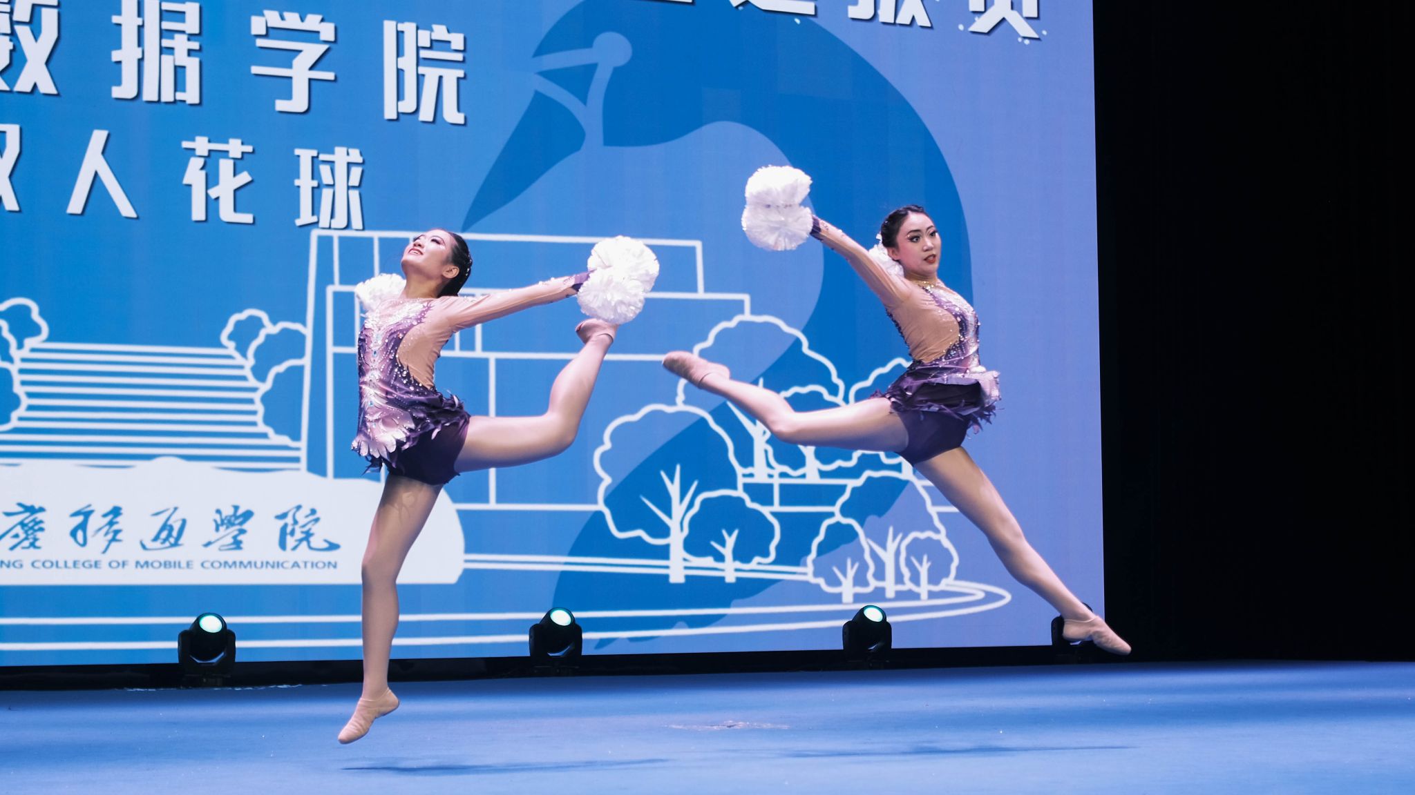 比赛伊始,剧院内热情的观众早已落座,翘首以盼这场青春盛宴的启幕。炫彩的灯光洒在舞台上,为这场赛事增添一抹亮色。首先映入眼帘的是双人花球项目的参赛选手们。她们两两一组,手捧鲜艳夺目的花球,迈着轻盈而矫健的步伐踏入赛场。音乐响起,她们如同两只灵动的蝴蝶,在花丛中翩翩起舞。花球随着节奏上下翻飞,时而如波浪般起伏,时而如烟火般绽放。跟随节拍,踏着动感的鼓点,弹跳着轻盈的脚步,身姿律动,动作优美,如跳跃的焰火使全场观众为之震撼,她们动感活力的舞姿充分展现了啦啦操与舞蹈的完美结合。她们的每一个眼神、每一个微笑都充满了感染力,将青春的活力与自信展现得淋漓尽致。