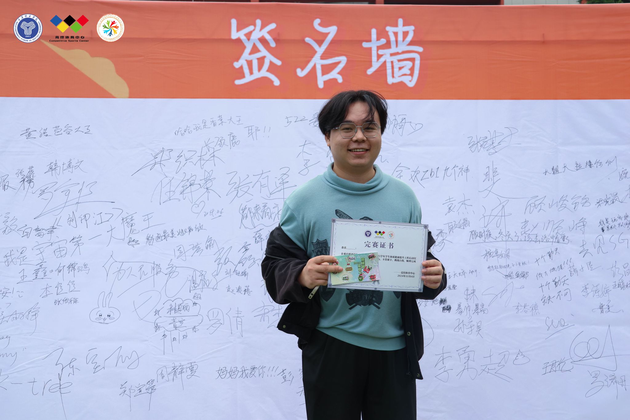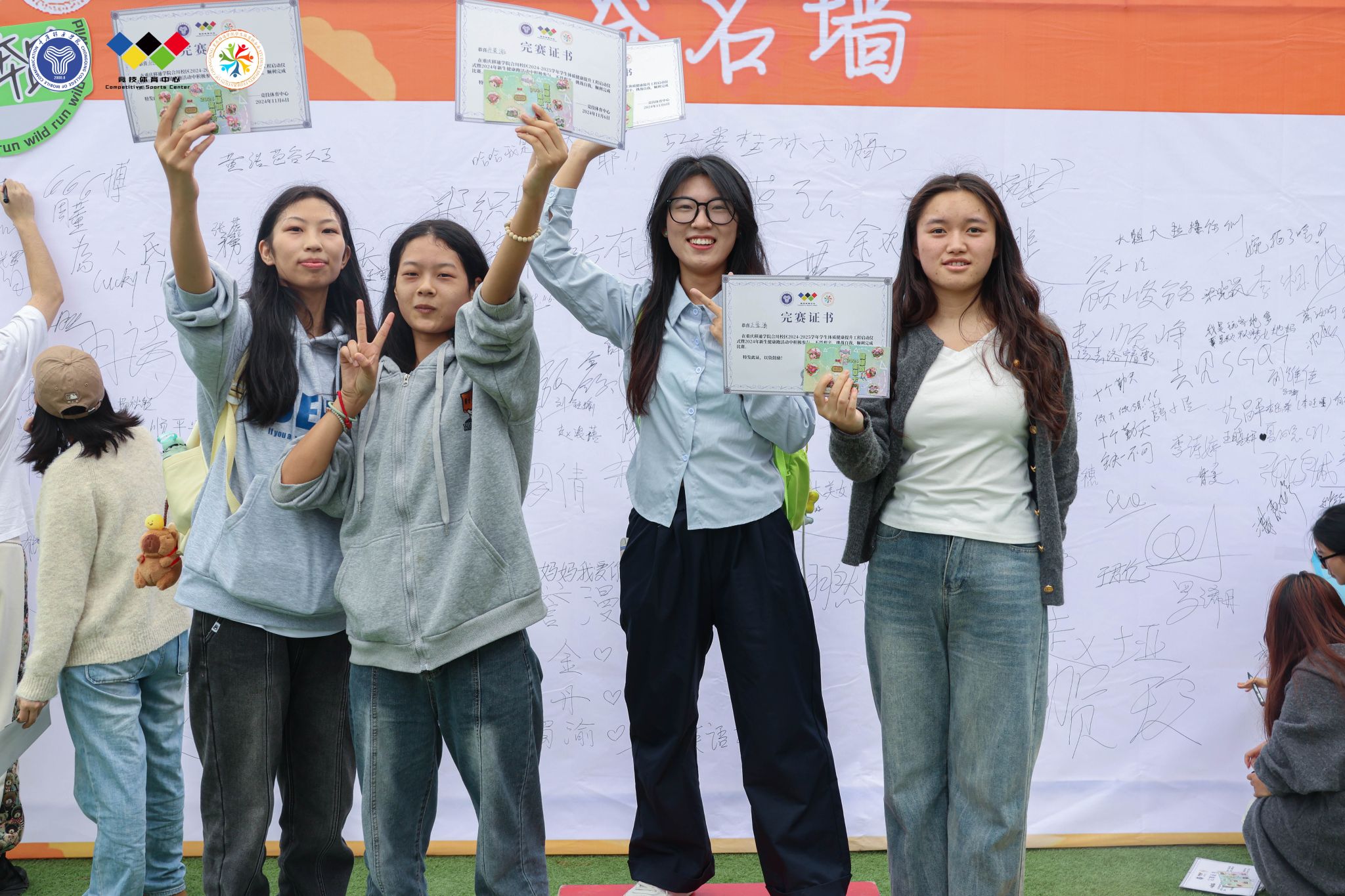 经过一段不长的等待后,校运动队的护旗手们率先抵达终点,冲向红线。伴随着他们的冲线,其他参赛选手也陆续抵达终点,在相关工作人员处进行查验签到并领取完赛证书。值得一提的是,许多参赛选手在完赛后纷纷前往签名墙留下自己的名字,并拍照留念,以此纪念这一难忘的经历。
