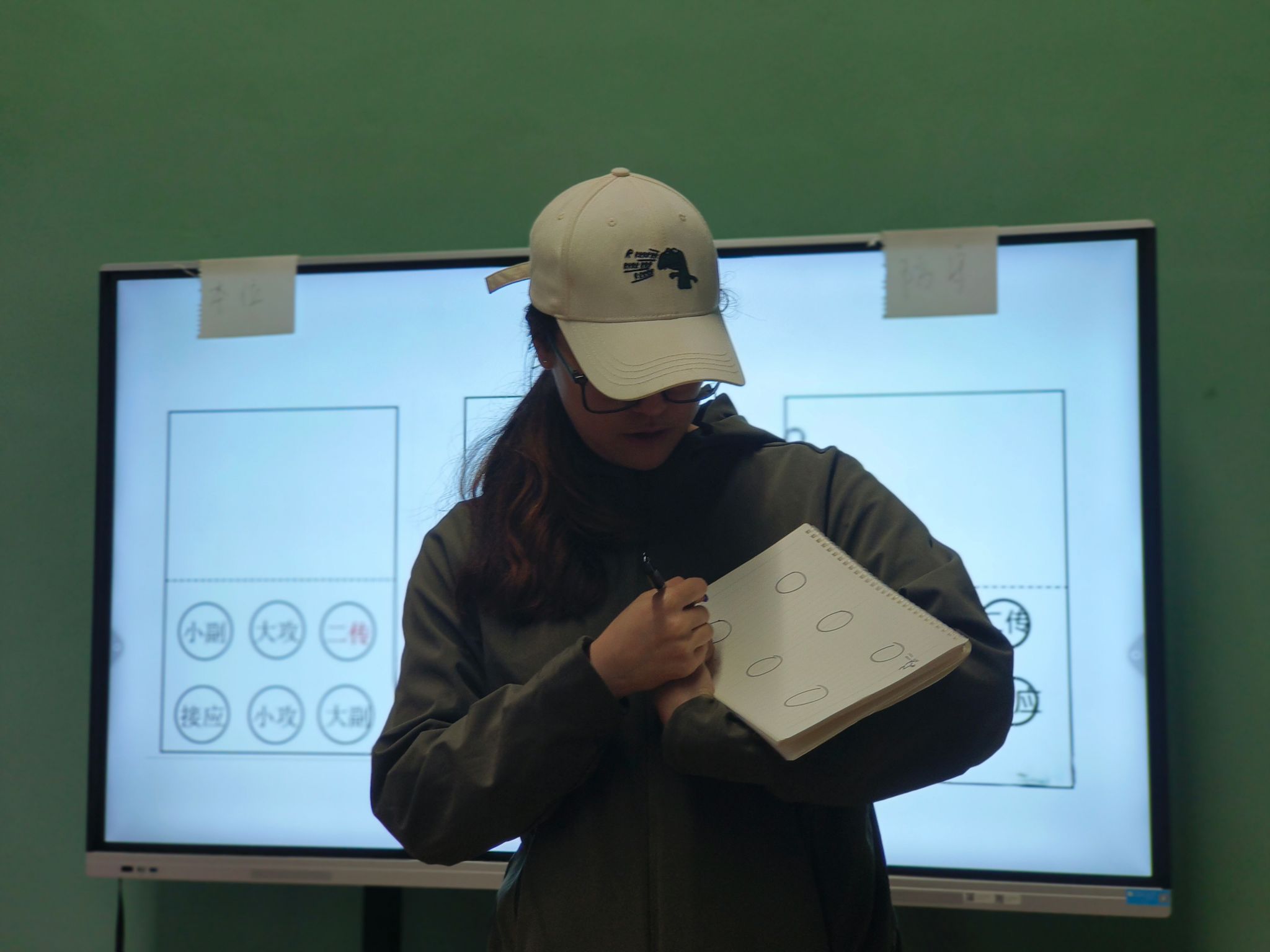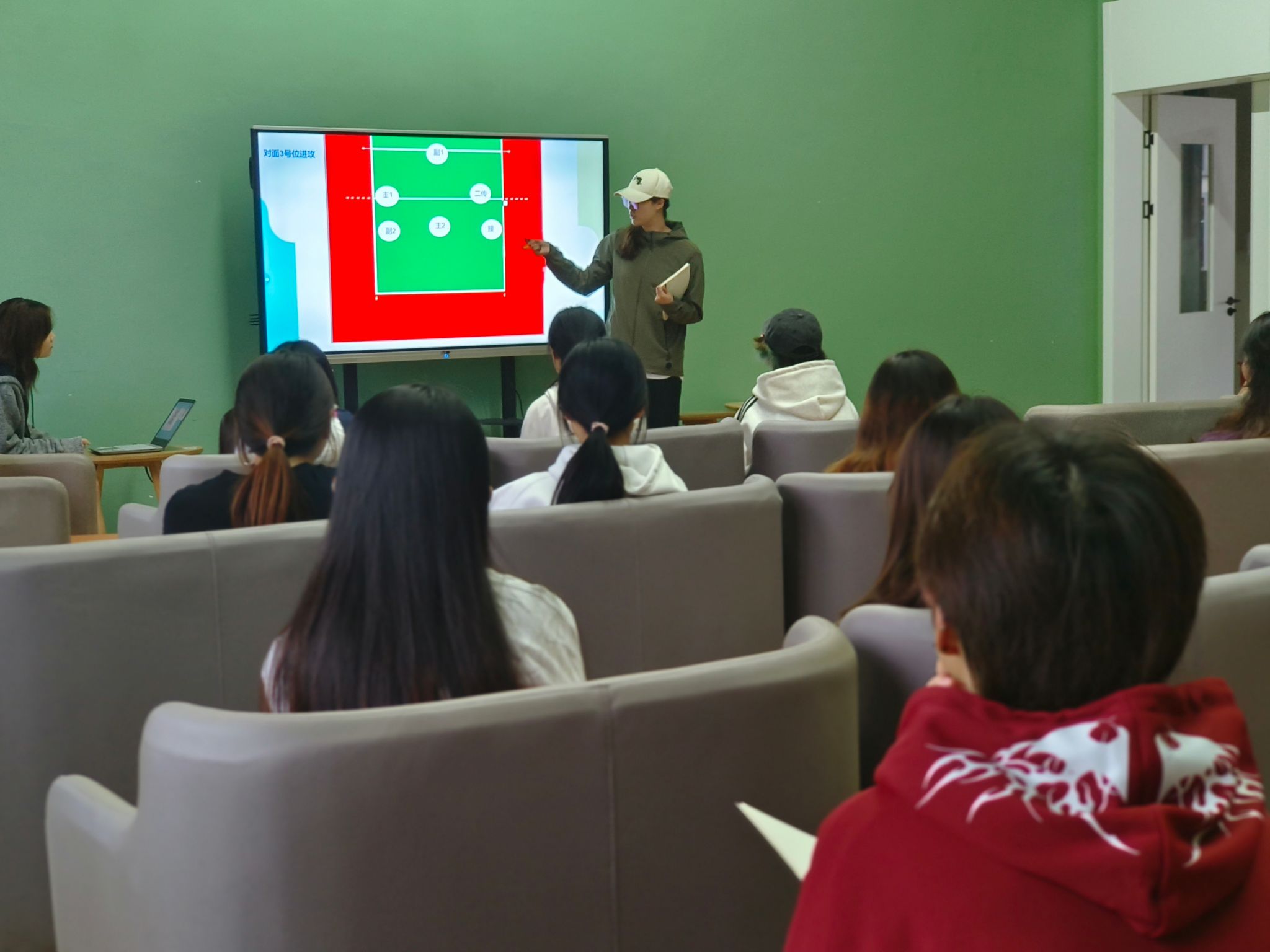接下来关于转位环节的讲解,廖教练通过ppt和手绘生动形象地演示了随着发球权交替,队员们应该如何进行有序转位,如何在场上找到能够发挥自己能力与优势的位置,队员们认真聆听并记小重点,不时点头示意,对排球比赛的规则有了更为深入的理解。在攻防转换方面的讲解,教练指出个人防守技术和团队攻防转换战术的重要性。从接球、垫球、传球到拦网,团队的协作与补位应确保球队防线的稳固,做好防守才能为进攻创造条件。队员们积极参与互动,提出问题,教练和队员耐心解答,现场气氛和谐热烈。
