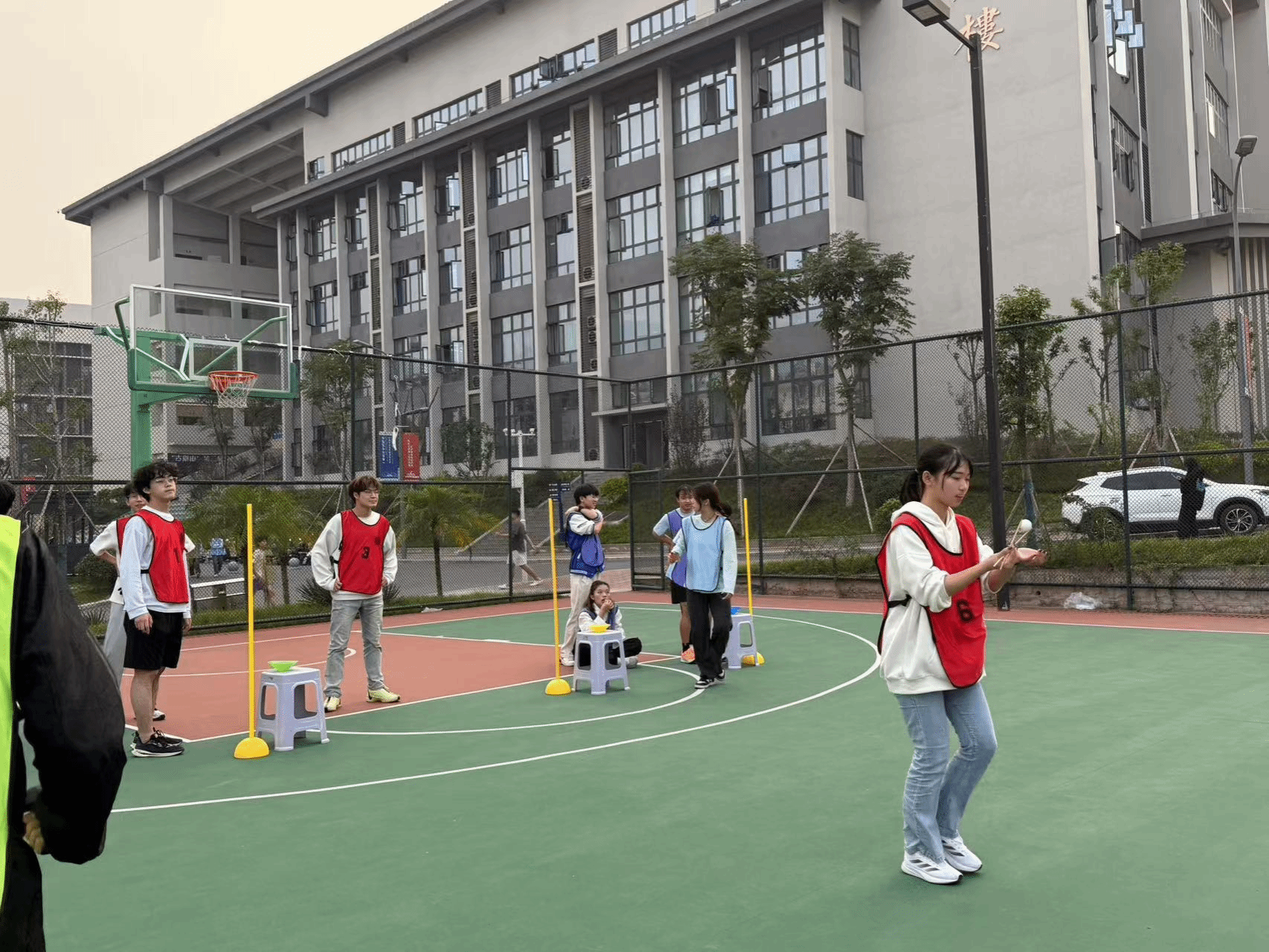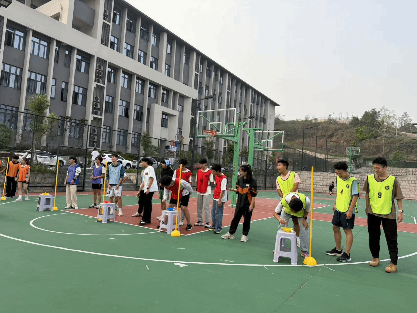 随后,杨钦老师介绍了此次团建的游戏内容、比赛章程与规则。队员们被分成6组,每组10人,参与大象鼻子走直线、运乒乒、两人三足、双人背夹运球等项目。桃花朵朵开抱团游戏中,队员们需迅速按规定人数组队,现场气氛热烈,队员们积极行动,展现出良好的团队协作能力和责任感。