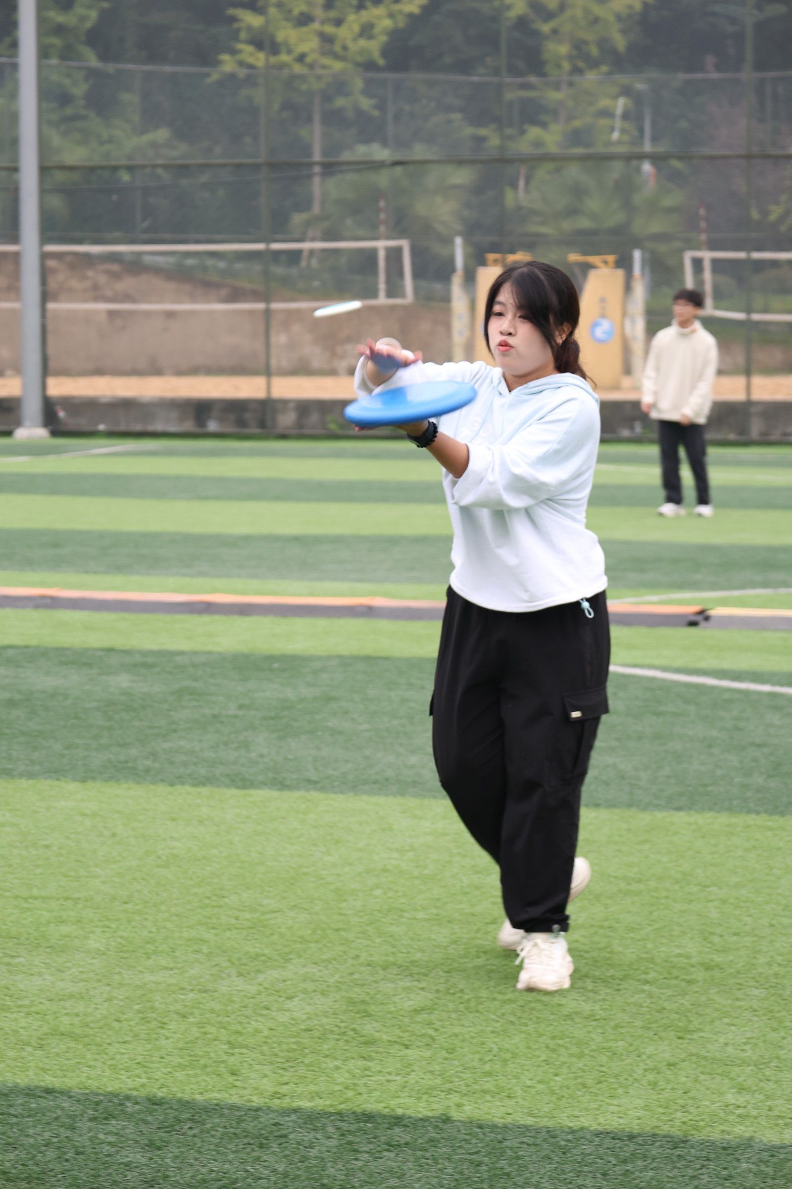 飞盘训练中,队员们分成小组,相互传接飞盘。他们不断练习着各种飞盘技巧,如正手投掷、反手投掷、高空接盘等,力求将飞盘控制得更加精准。