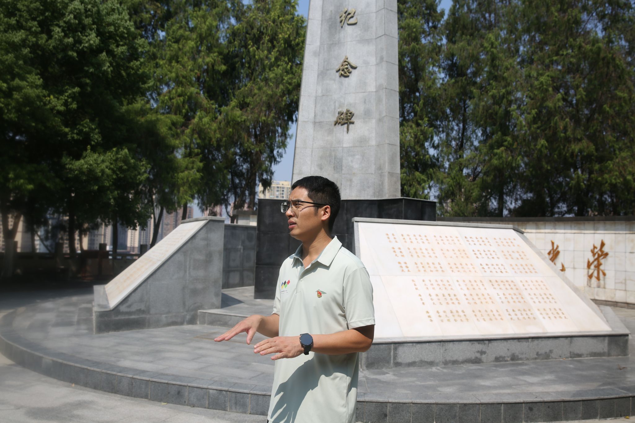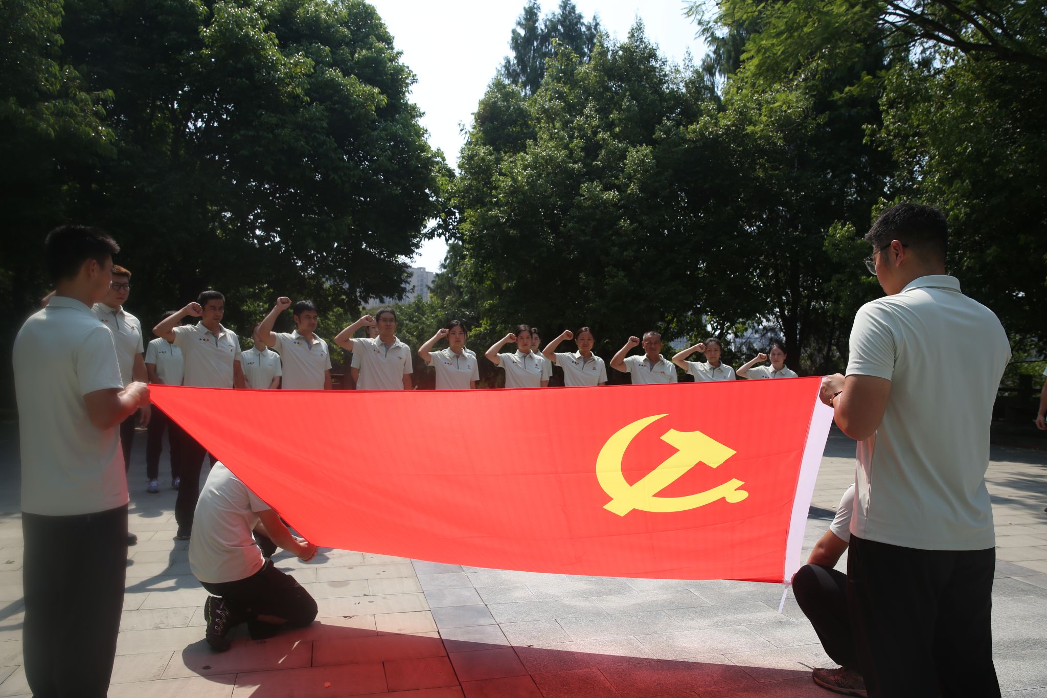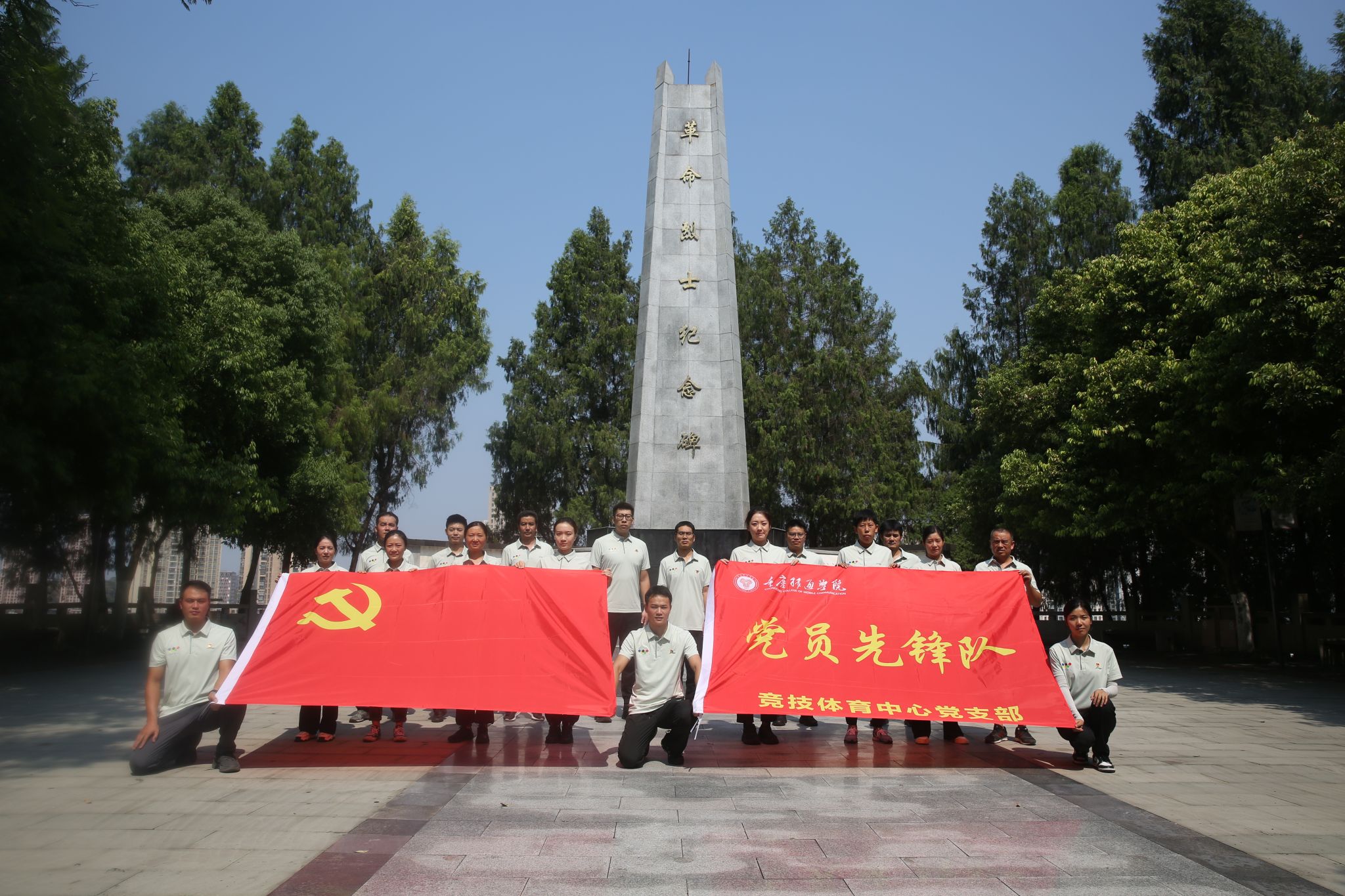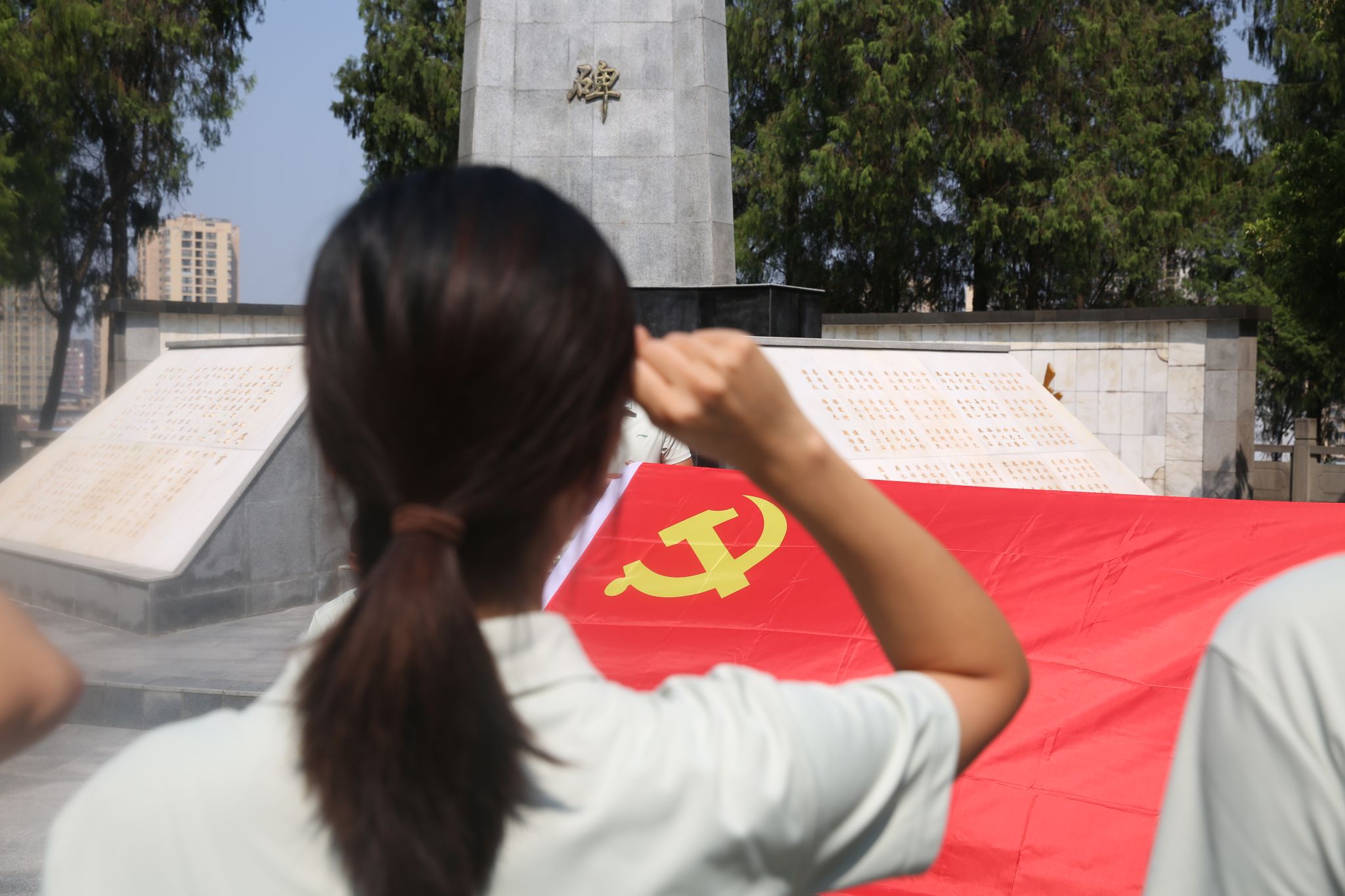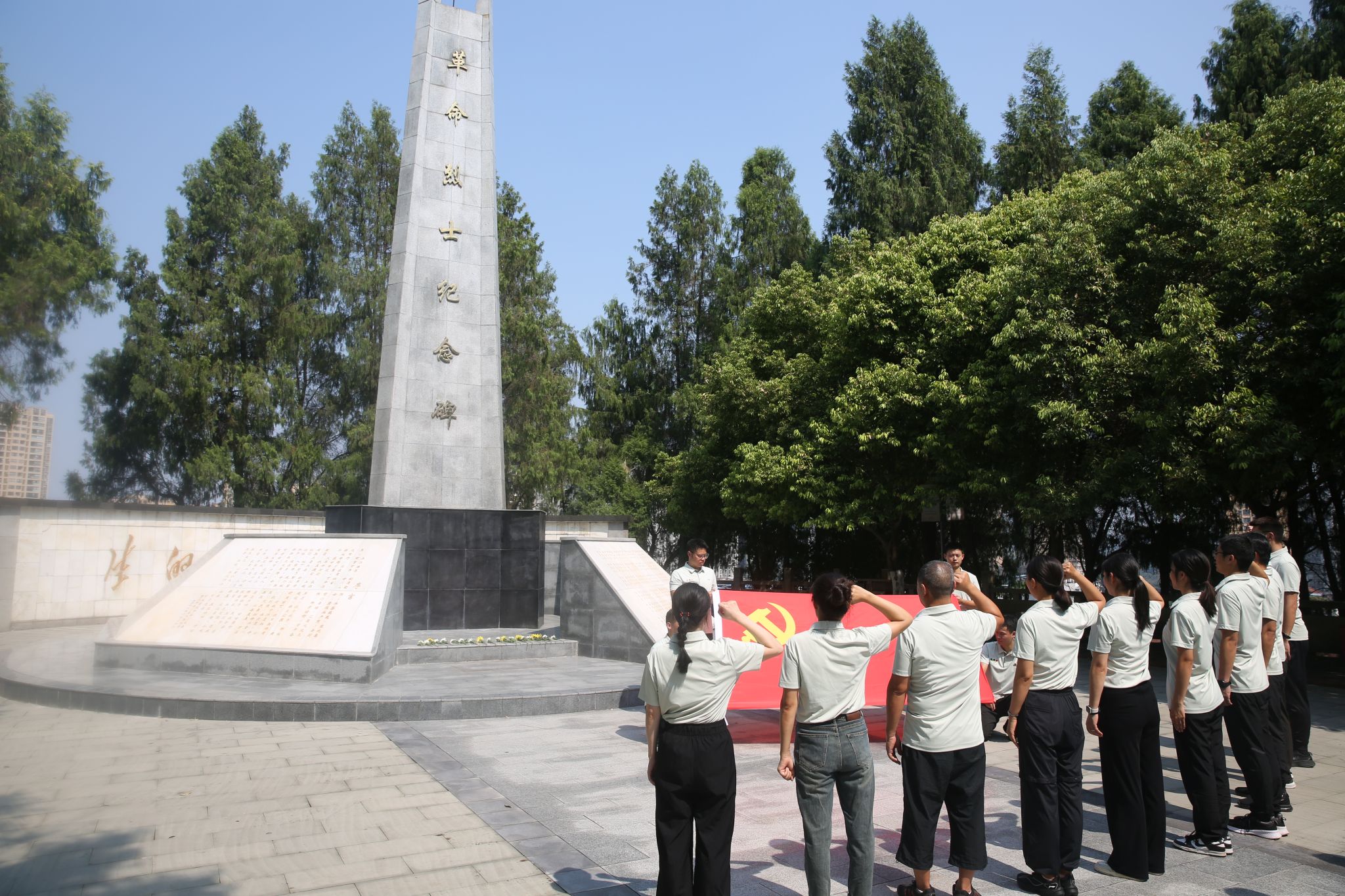 在纪念碑前,面对鲜红的党旗,党支部副书记余青河带领全体党员重温入党誓词,进一步坚定了党员同志对党忠诚的崇高信念。