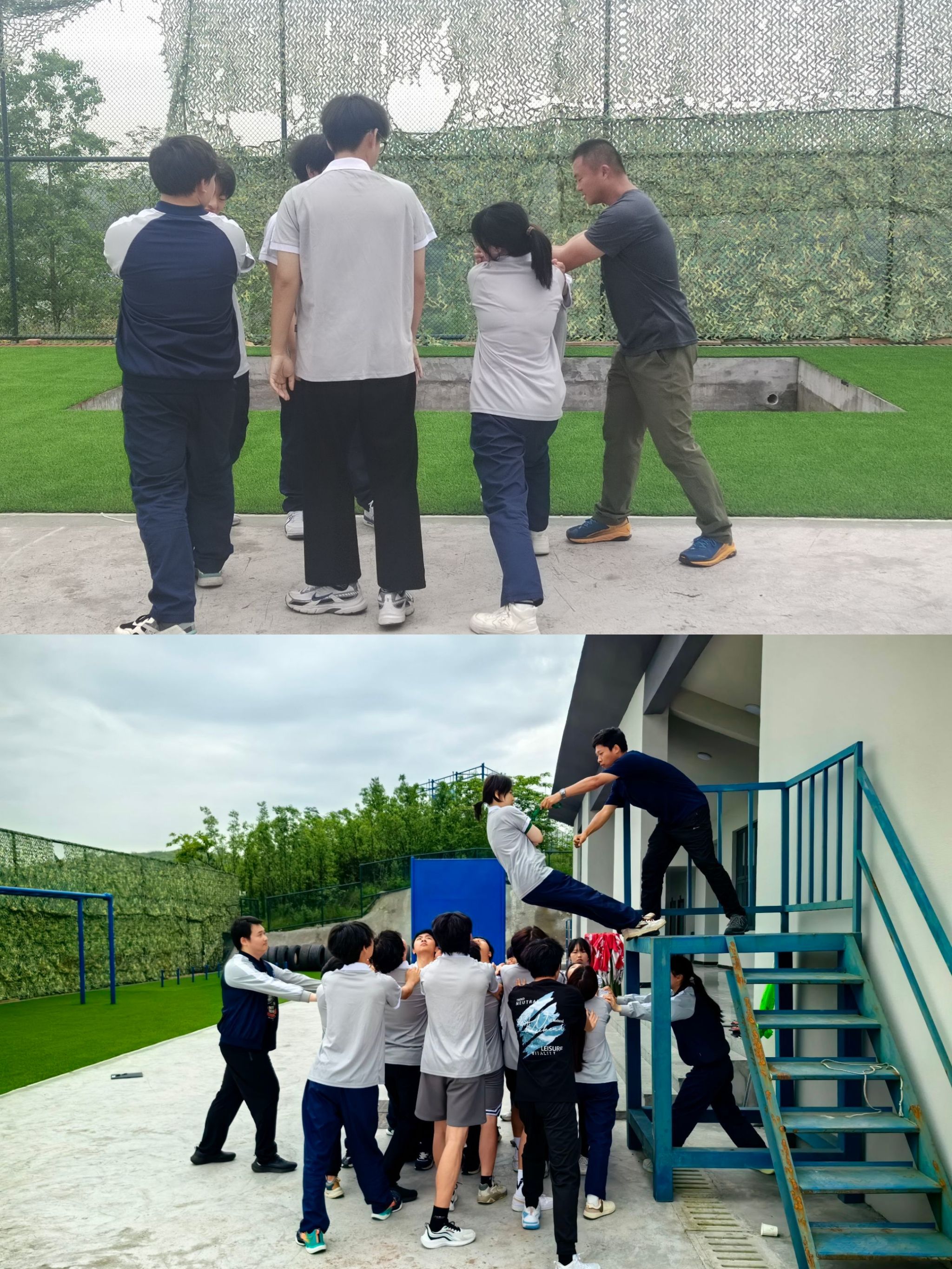 第二个项目:背摔。其旨在磨砺学生们的团队协作能力。在教官的引导下,同学们进行在背摔台上向后倒并通过队友的团队协作实现安全着地的体验。当一个人向后倒时,所有的队友都全力以赴、齐心协力,为处于上方的队员提供坚实保障。即便忍受着疼痛也绝不放手,不放弃任何一位队友。同学们塑造出了团队合作精神,并且获得了应对挑战的能力。同学们在面对挑战时展现出坚韧不拔的精神,大家学会了如何与他人合作,以及如何共同面对困难。