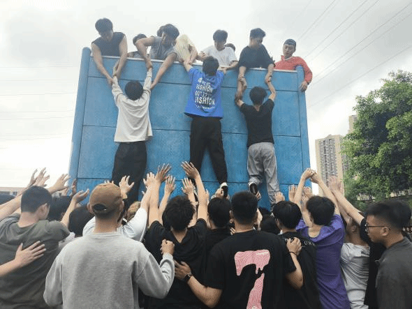 伴随着训练项目一个个的进行,同学们放下开始的羞涩,积极参与游戏,之间陌生的隔阂渐渐消失。“海难逃生墙”环节,在不借助任何外力的情况下全体同学通力合作徒手翻越4米2高的墙壁。这是集体智慧与力量的展现,不仅考验了团队成员的团结协作精神,更让大家深刻理解了信任与付出的重要性。挑战者们必须相互扶持,共同攀登,才能成功翻越这堵高墙。在这个过程中,每个人都需要放下身段,甘当垫脚石,为队友提供支撑。活动中,一幕幕感人至深的场景不断上演。有的队员不顾自身安危,用肩膀扛起队友,帮助他们越过障碍;有的队员在关键时刻挺身而出,用双手托起沉重的身躯,为团队争取胜利的机会。这些看似微小的举动,却凝聚着团队成员之间的深厚情谊和无私付出。同学们凭着相互的信任和默契,通过团队合作能力顺利完成。项目结束后,同学们忍不住哭泣,在泪水中感受着集体荣誉感。