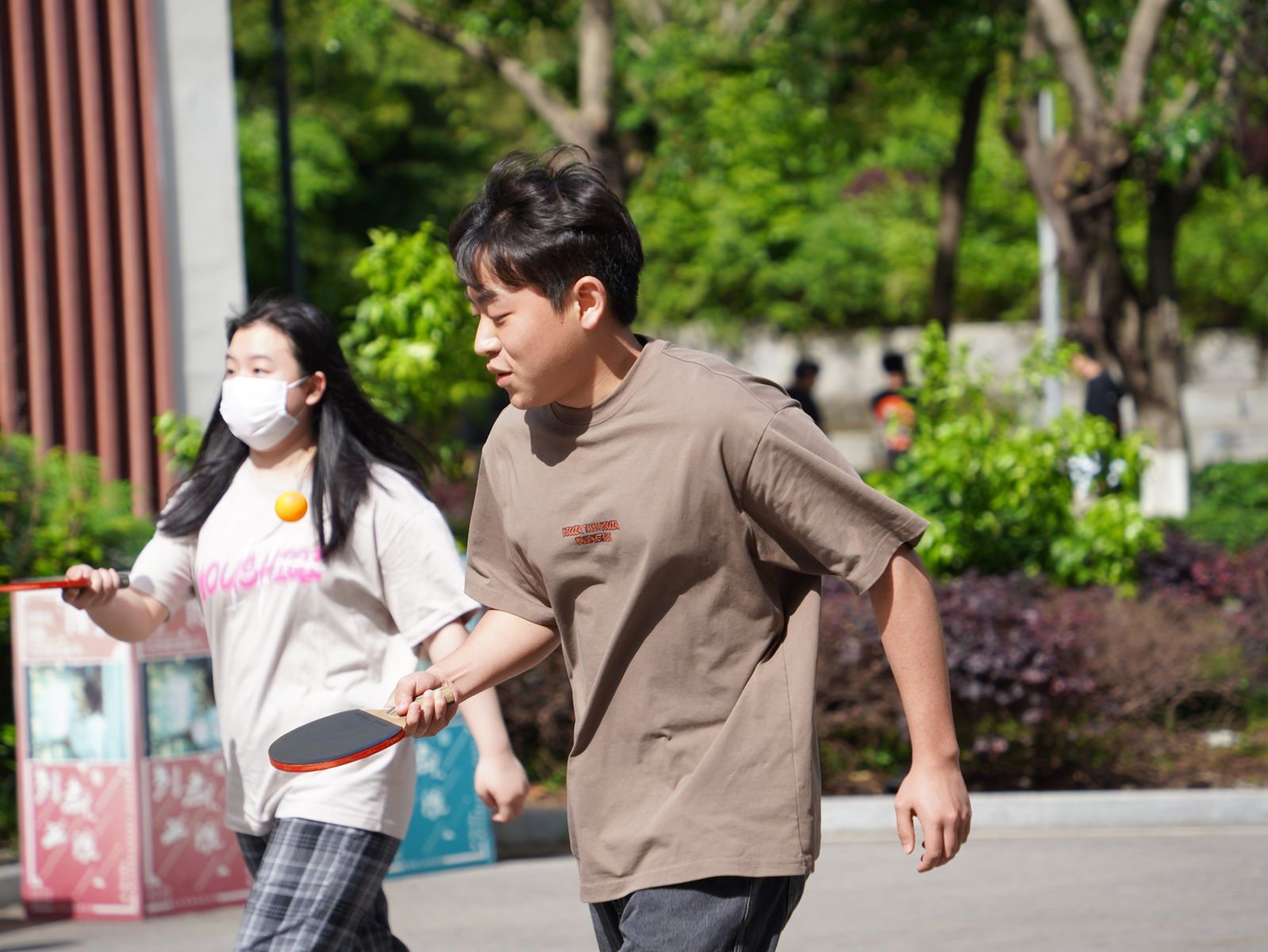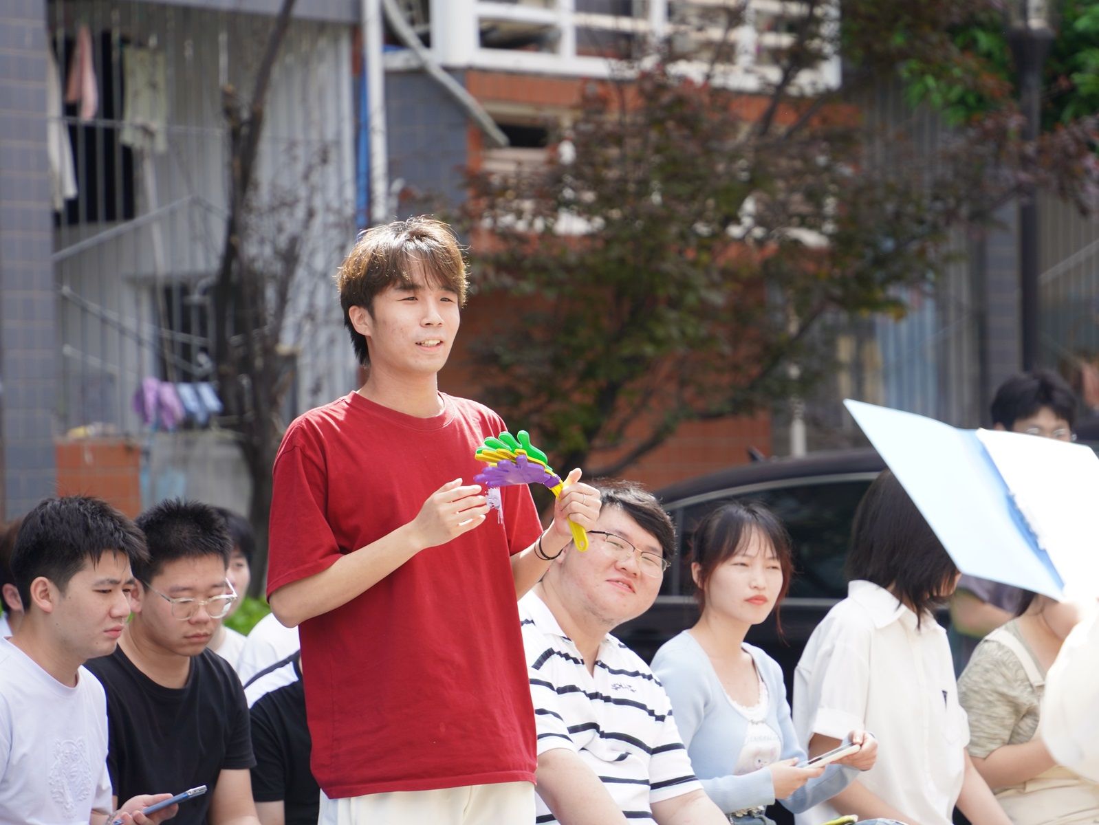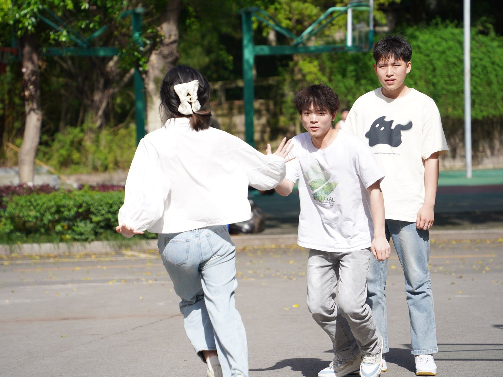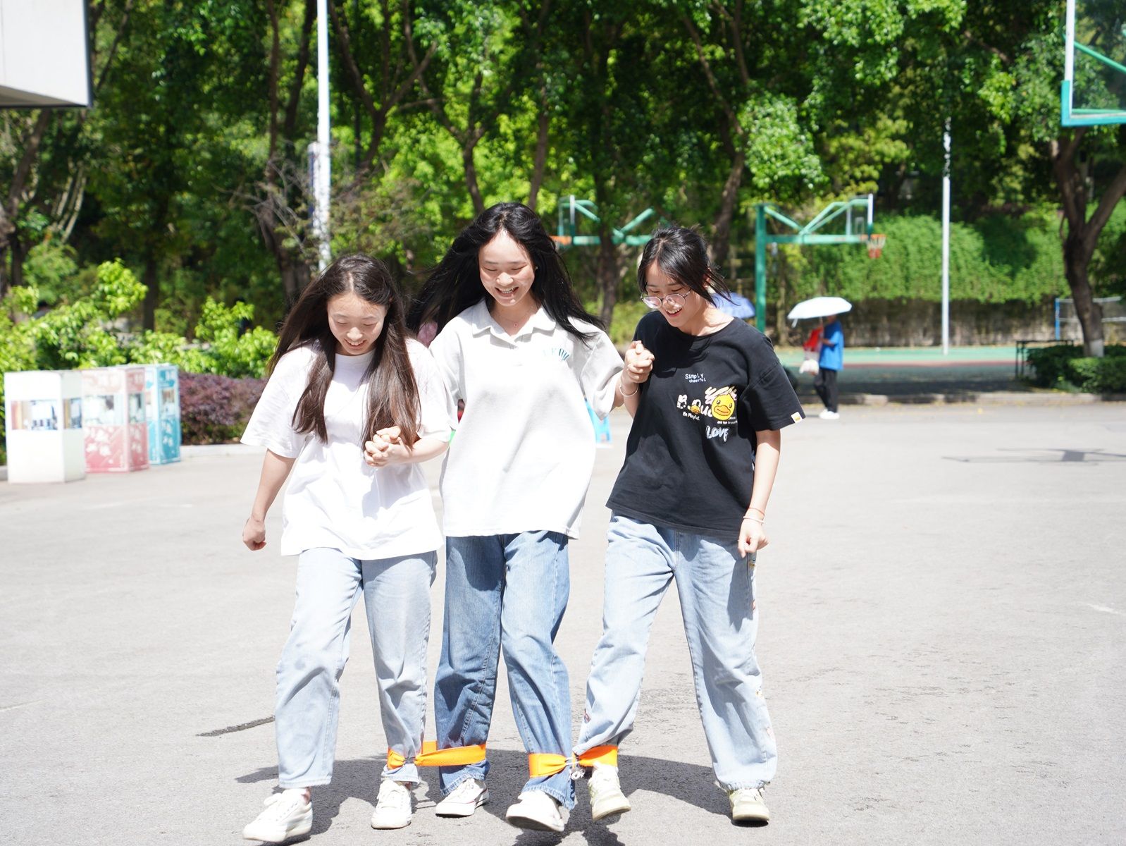 在知识问答的同时,各个项目的参赛者早已做好热身准备,将自己的身体调整到最佳状态。一系列精彩纷呈的运动项目即将开始。在“合力同行”三人四足挑战赛,三支队伍奋勇争先,配合默契,步调一致,以最快的速度向终点飞奔而去,团队协作精神在他们身上体现的淋漓尽致。在“踢趣无限”毽子大作战中,三位女同学轻盈跃动,分秒必争,在两分钟内让毽子在空中划出一道道美丽的弧线。在“挥拍飞扬”飞运乒乓快乐赛中,参赛者们不但要保持速度,还要时刻注意乒乓球不能掉落到地上,这是手和脚的双重考验。在“疾风迎面,接力狂奔”迎面接力赛中,每一次击掌都充满着惊险与刺激。比赛在一片热烈的气氛中展开,场外的同学们为参赛者们加油打气,同学们的欢呼声与助威生不绝于耳,现场气氛瞬间达到了高潮。