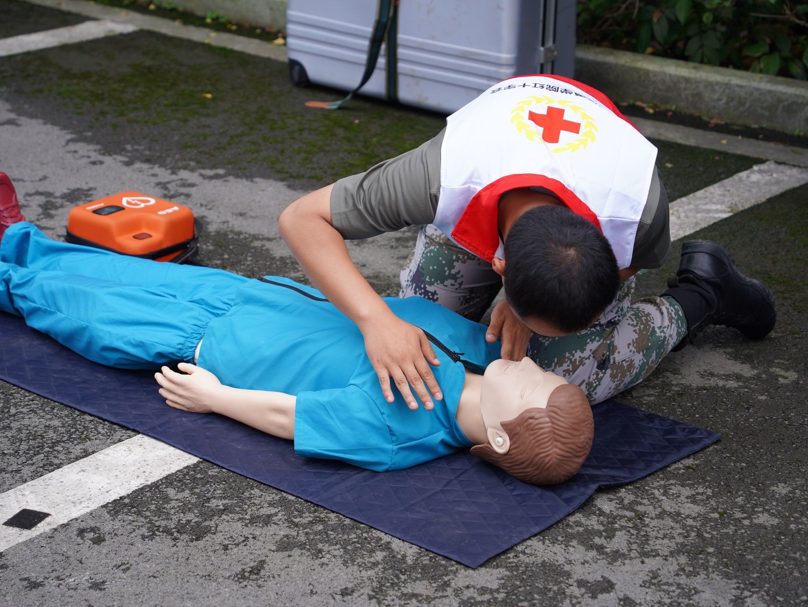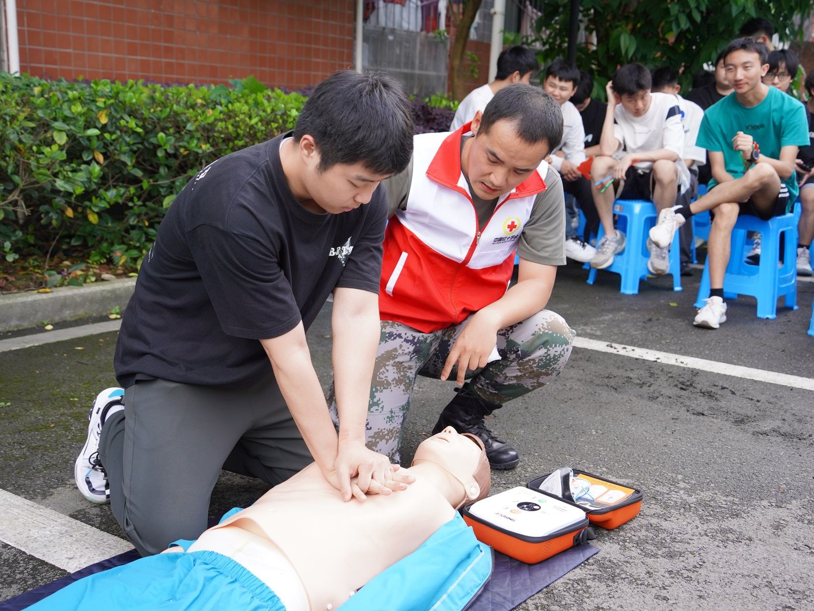 在四项趣味运动结束后,营地教育中心陈玮教练为同学们带来了应急急救知识的讲解和示范,利用假人细致介绍了如何用“意识-呼吸-脉搏”的方法确定伤者的状况,具体演示了如何正确进行人工呼吸和心肺复苏,以及AED的使用方法,并在现场邀请同学体验实际操作。俗话说,技多不压身,正如陈玮教练说的那样:“宁愿大家永远用不上,也不希望在紧急情况下在旁边看着却无能为力”。这一环节不仅让同学们对急救知识有了一定的了解,也增强了大家的安全意识,在突发事件发生时,保护自己和他人的生命安全。