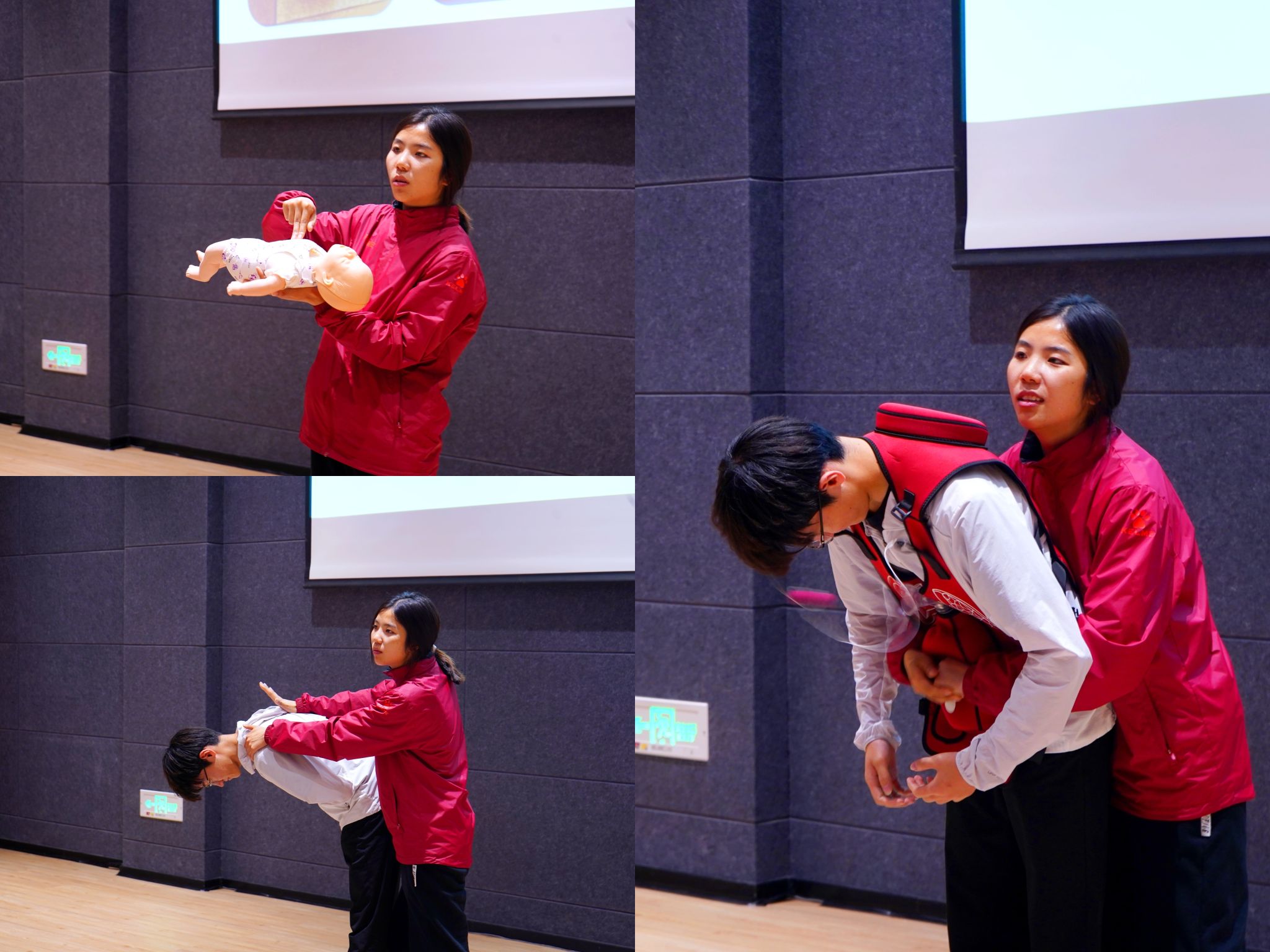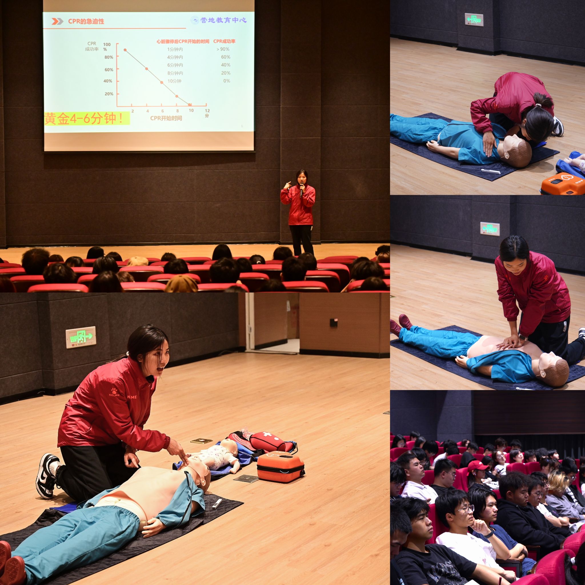 据统计,中国每年猝死人数超过50万,远远超过死于自杀、交通事故、白血病等的人数,而我国心源性猝死总人数约为每年55万。面对如此庞大的数据,急救技能显得尤为重要。“当有人晕倒,救还是不救?”李青青教练用通俗易懂、生动幽默的语言引出心肺复苏术应急救护的六个步骤,包括评估环境、判断呼吸、呼救、胸外按压、打开气道检查清除异物、人工呼吸。李教练通过讲解、演示和实操等方式,向同学们传授心肺复苏术以及自动体外除颤器(AED)的完整操作步骤。并通过播放心肺复苏术的错误示范案例,让同学们深刻认识到急救技能的重要性,增强安全防范意识。