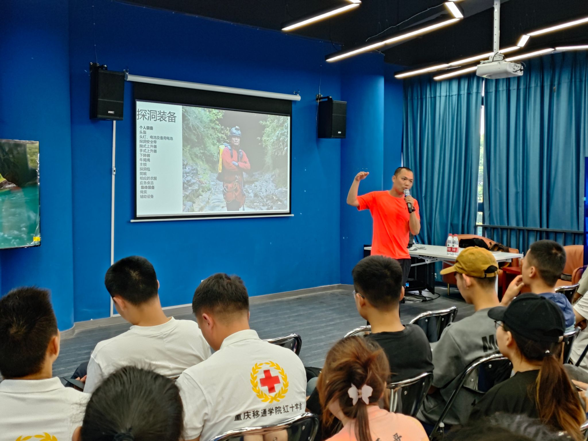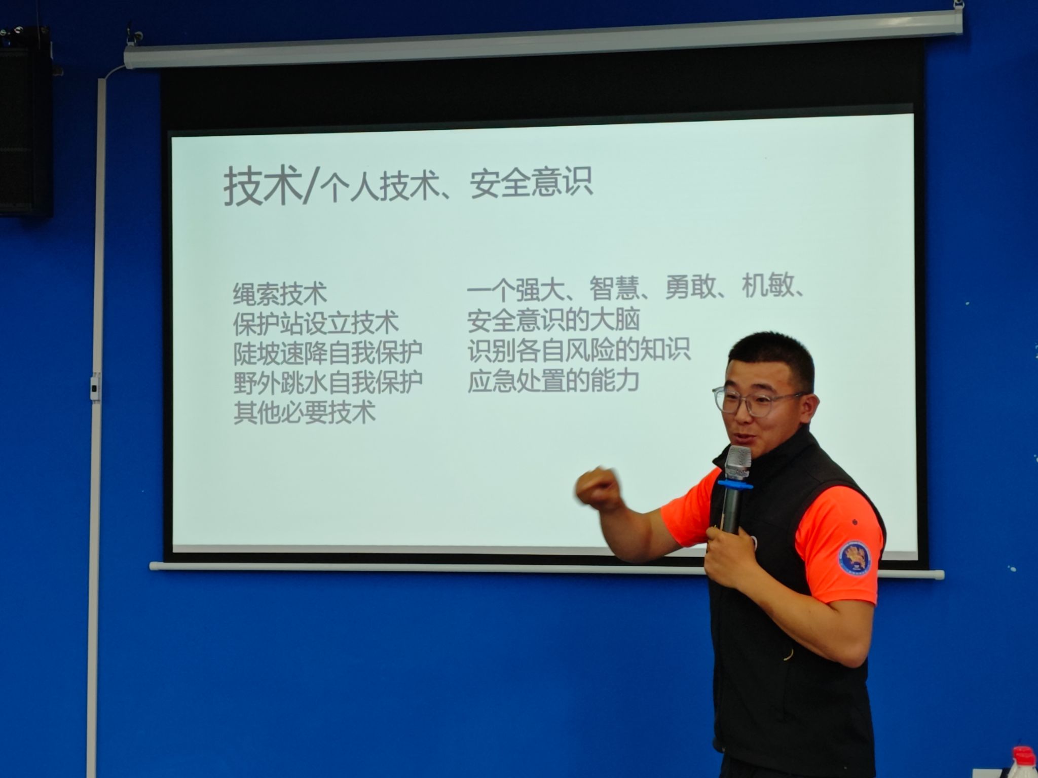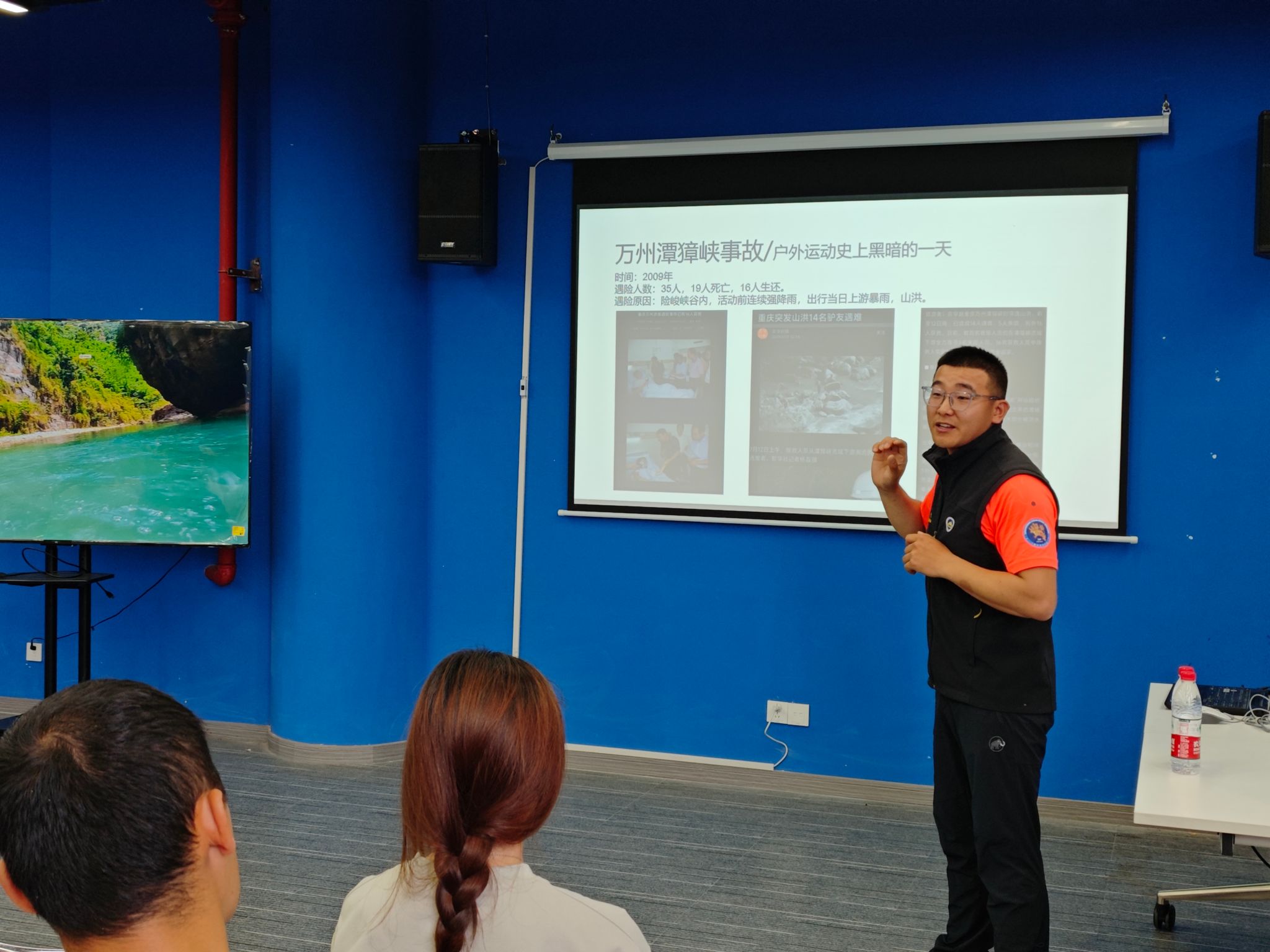 第一位和大家分享经验的是来自中国登山协会的中级户外指导员、国家职业攀岩中级指导员廖俊凯老师。他给同学们讲解的是溪降和溯溪两个项目的特点和运动方法,生动详细地向大家介绍了溪降的4种动作要领、注意事项以及重庆地区内的经典溪降线路。廖老师以两次事故案例为背景,向大家剖析了事故发生的原因和规避方法,同时从技术、装备、环境三个方面为同学们梳理和总结了相关专业知识。鼓励同学们好好的学、好好的玩、安全的玩,生而向上,做一个敢想敢玩的人。